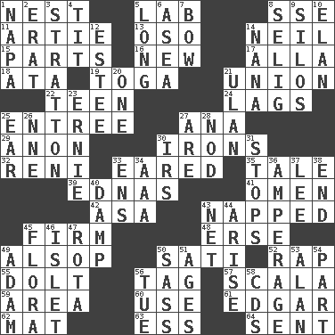 ACROSS 1. Egg locale 5. Experiment locale 8. Compass dir. 11. Nick name for Arthur 13. Bear (Spanish) 14. Famous astronaut Armstrong 15. Components 16. ___ Haven, CT 17. Silent film actress Nazimova 18. "One Day ___ Time" 19. Ancient Roman robe 21. The state of being joined or united 22. Adolescent 24. Falls behind 25. Main course 27. Santa ___, CA 29. Soon (poet.) 30. Metal shackles 32. Painter Guido (1575-1642) 33. Having ears or earlike features 35. Falsehood 39. Ferber et al. 41. Sign of things to come 42. White ___ sheet 43. Slept 45. Securely fixed in place 48. Celtic language 49. Columnist Joseph or Stewart 50. Suttee (variant) 52. Hit sharply and swiftly 55. Stupid person 56. Label 57. Any of the three canals of the cochlea 59. Length times width 60. Purpose 61. _ Allan Poe 62. Floor protector 63. Curvy letter 64. Emitted DOWN 1. California wine valley 2. Part of Q.E.F. 3. Ski resort town in Vermont 4. Teat (slang) 5. Yearn 6. At sea 7. Arrow shooter 8. Major League Baseball Commissioner Bud 9. Grain storage towers 10. Flair 12. First name in cosmetics 14. Nanny 20. Single 21. Uhlan (variant) 23. Bert's buddy 25. Hearing organ 26. Compass dir. 27. "We ___ not amused" (Victoria) 28. Allow head to fall sleepily 30. Big collection agency 31. Constricts 33. Followers of ems 34. American Automobile Association (abbr.) 36. Electrical Measurement 37. Area sheltered from the wind 38. Conclude 40. Moist 43. Fish or hair follower 44. Get up 45. Plants 46. Small island 47. Roll call or roster of names 49. First man 50. Backtalk 51. Ripens 53. Actor Alda or Thicke 54. Role in a play 56. Third day of the wk. 58. Music discs