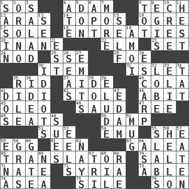 ACROSS 1. Mayday 4. First of billions? 8. Georgia ____ (Atlanta school) 12. Caspian sea tributary 14. Literary convention 16. Legendary monster 17. Flatfish 18. Pleas 20. Lacking in sense or substance 22. Shade tree 23. Arrange properly for use 24. Dreamland 25. Compass dir. 28. Enemy 30. A whole individual unit 31. Small island 35. To free from 37. Helper 40. Root beer relative 41. "You Light Up My Life" star Conn 42. Fur scarf 44. "This won't hurt ____!" 45. Margarine 46. Saudi Arabian king (1953-1964) 47. Portuguese money of account (variant) 48. Theater features 50. Moist 52. Take to court 54. Australian flightless bird 55. A female animal or person 58. Oval reproductive body of a fowl 61. Car or cant ending 63. An organ shaped like a helmet 65. Interpreter 70. Table seasoning 71. Nathan's nickname 72. Damascus' land 73. Competent 74. At sea 75. Filth; sediment 76. Male offspring DOWN 1. Indian antelope 2. U. of Maine site 3. First course 4. Had dinner 5. Spanish title 6. Fitting 7. Greater amount 8. Small child 9. Armor plate that protects the chest 10. Algonquian 11. Behest 13. Elected rep. 15. Automatically 19. Mine, in Marseilles 21. Eastern Standard Time (abbr.) 26. Oceans 27. Gives off 29. Fortification 30. Foolish or stupid persons 32. Ear part 33. Writer Wiesel 34. Make lace 35. Cause heat under the collar 36. The main thing one is thinking about 38. ___ good deed 39. Dodge 41. Two (Sp.) 43. Dutch treat 49. Takes to court 51. Java container 53. Snakelike fish 55. Thick slices 56. Phone greeting 57. Ingested 58. Inactive volcano in Sicily 59. Pate de foie ____ 60. Yard entry 62. Negative votes 64. White ___ sheet 66. Teachers' org. 67. Three (prefix) 68. Petroleum 69. Actress Charlotte