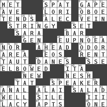 ACROSS 1. Was introduced to 4. Petty quarrel 8. Open wide 12. "___ Maria" 13. Australian parrot (variant) 14. Mitch Miller's instrument 15. Looks after 18. Actor Baldwin 19. Distinctive style or manner 20. Slender, wiry 22. Put into a specified state 23. "Two Mules for Sister ____" 24. Oblong piece of solid material 25. Commissioned military rank (abbr.) 26. Normal relaxed breathing 30. Not either 33. Having the leading position 36. Scent 37. Type of rug 39. Greek goddess of the dawn 40. Monthly bill 41. Strained 42. Natives or inhabitants of Denmark 44. Compass dir. 45. Shoved, as through a crowd 47. Call ___ day 50. ___ Haven, CT 51. Soft 53. Make lace 54. Orator 57. Of or related to the anus 59. Jai _ 61. Vegetable dish 63. Not ill 64. Drop; flow; fall 65. One more than two 66. Made of lace 67. Tenement units (abbr.) 68. Single DOWN 1. Floor covering 2. Nights before holidays 3. Portable shelters 4. Volcanic refuse 5. Many (prefix) 6. "We ___ not amused" (Victoria) 7. Nervous spasm 8. State head 9. Collude with 10. Luau course 11. Car or cant ending 16. To be drawn or hauled along 17. Male parent of an animal 21. Nanny 22. Plant excrement 24. Partially opened flower 26. Comfort 27. Lyric poems 28. Immeasurably long periods of time 29. Johnson of "Laugh-In" 30. Nathan's nickname 31. Of the mouth 32. Reuben's nickname 34. Froth on beer 35. A really long time 38. Lacking a tonal center or key 42. Morning condensation 43. Trig term 46. Dripping 48. Beverages made from leaves 49. "____ silly question..." 52. Sun: prefix 53. Baby powder 54. Table seasoning 55. Sliced desserts 56. Water falling in drops from the sky 57. Leather borer 58. Teachers' org. 59. White ___ sheet 60. Mouth edge 62. Pass on