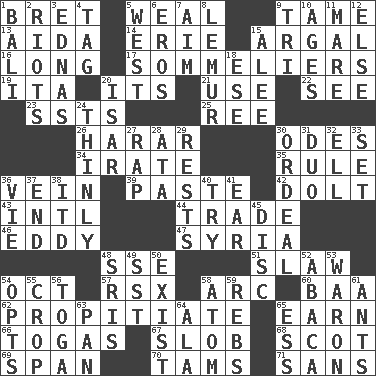 ACROSS 1. Cy Young winner Saberhagen 5. Welt 9. Not wild 13. Opera by Verdi 14. One of the Great Lakes 15. Therefore, facetiously 16. Having great length 17. Wine waiters 19. Call ___ day 20. ___ a Wonderful Life 21. Purpose 22. Observe 23. Fast planes 25. To riddle 26. Ethiopian city, capital of Harari 30. Lyric poems 34. Feeling or showing extreme anger 35. General guideline 36. Distinctive style or manner 39. Thick mixture 42. Stupid person 43. International (abbr.) 44. Swap 46. Whirlpool 47. Damascus' land 48. Compass dir. 51. Cole _ (cabbage dish) 54. Sep. follower 57. Acura sports coupe 58. Curve 60. Sound made by sheep 62. Conciliate 65. Merit 66. Ancient Roman robes 67. Messy guy 68. Highlander 69. Connect, as a bridge 70. Scottish caps 71. Without DOWN 1. Indonesian resort city 2. Disturbances 3. Ferber et al. 4. Label 5. 270 degrees 6. Greek god of love 7. Direct toward a target or goal 8. Arboreal primate 9. Three (prefix) 10. Grows older 11. Female horse 12. Otherwise 15. Toward shelter 18. Compass dir. 20. Austrian river, tributary to the Danube 24. Without thickness 27. Reproach for some lapse or misdeed 28. _ moment's notice (2 wds.) 29. Musical pauses 30. Severe or trying experience 31. Superhero pair 32. Pipe bend 33. Put into a specified state 36. Compete 37. Conclude 38. It would 40. Attempt to accomplish something 41. Ewer handle 45. Plate 48. Indian titles of respect 49. Fast jet (abbr.) 50. Be extant 52. Phillipine bananalike plant 53. Make _____ (do battle with) 54. Elects 55. Riding implement 56. Ancient Roman robe 58. Smallest unit of an element 59. Confederate soldiers (slang) 61. Pismires 63. Baking dish 64. According to 65. Curvy letter