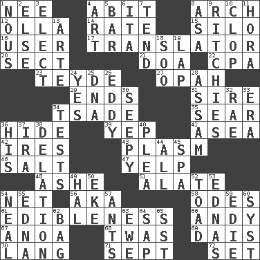 ACROSS 1. Born 4. "This won't hurt ____!" 8. Bowlike part 12. Water jar 14. Assign a rank or rating to 15. Grain storage tower 16. One who makes use of a thing 17. Interpreter 20. Religious group 21. ___ good deed 22. Numbers guy (abbr.) 23. Miss Universe 1986, Barbara Palacios _ 27. Brightly colored fish 29. Conclusions 31. The founder of a family 34. Sadhe (variant) 35. Burn superficially 36. Flintstone garb 39. Slangy assent 41. Toward the sea 42. Angers 43. Suffix with ecto or cyto 46. Table seasoning 47. Sharp bark 48. American tennis player Robert 51. Having winglike extensions 54. Fish or hair follower 56. Alias (abbr.) 58. Lyric poems 61. The property of being fit to eat 66. Actor Griffith 67. Small Philippine buffalo 68. It was, poetically 69. Raised platform 70. Austrian-born American filmmaker Fritz 71. Back-to-school mo. 72. Arrange properly for use DOWN 1. Horse sense 2. Otherwise 3. Opt 4. Nonscientific branch of learning 5. Tavern 6. Call ___ day 7. Watch over 8. White ___ sheet 9. Actors Guy, Robert Welles, and Clint 10. Hoof sound 11. Israeli folk dance 13. Johnson of "Laugh-In" 18. "Barney Miller" actor Jack 19. Infant locale 24. Affirmative reply 25. Heredity factor (abbr.) 26. Whirlpool 28. Indian state 30. Not well drained, as in land 32. Actress Charlotte 33. Period 34. Trials 36. Part of HMS, perhaps 37. Retirement account (abbr.) 38. Accusation by an informer 40. Entreaty 44. Everything 45. Health resort 49. Actor Linden 50. Make supply last 52. Frog relative 53. Ferber et al. 54. Anneal 55. Pulitzer Prize-winning author Ferber 57. Pismires 59. Singer Brickell 60. System (abbr.) 62. Paper or plastic container 63. She-sheep 64. Plant excrement 65. Fast jet (abbr.)
