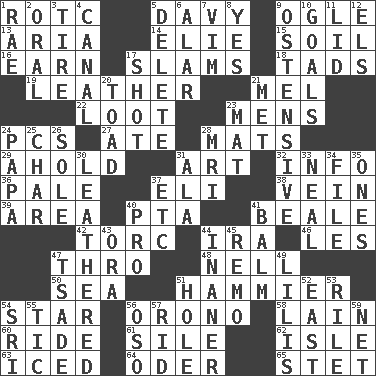 ACROSS 1. College mil. group 5. American folk hero Crockett 9. Stare 13. Roberta Peters solo 14. Writer Wiesel 15. The visible part of the earth's surface 16. Merit 17. Hits or strikes with great force 18. Bits 19. Cordwainer's material 21. Cartoonist voice _ Blanc 22. Plunder 23. Not women's 24. Personal Computers (abbr.) 27. Had dinner 28. Floor protectors 29. Hold, grip (Informal) 31. Nonscientific branch of learning 32. Information 36. Light colored 37. Biblical high priest 38. Distinctive style or manner 39. Length times width 40. Parent Teacher Assoc. 41. Memphis, Tenn. Street 42. Torque (variant) 44. Retirement account (abbr.) 46. French article 47. Through, poetically 48. 1994 drama film starring Jodie Foster 50. Ocean 51. More given to overacting 54. Play the lead 56. U. of Maine site 58. (Had) reclined 60. Travel on an animal 61. Filth; sediment 62. Capri or Wright 63. On the rocks 64. Baltic tributary 65. Proofreading order DOWN 1. Actress Charlotte 2. Relating to the mouth 3. Hoop that covers a wheel 4. Lessep's creation 5. Erase 6. Having or resembling wings 7. Zeal 8. Consenting reply 9. Clearly or manifestly demonstrative 10. Scores awarded for successful feats 11. Hat (slang) 12. Raised railways 17. Went for two points 20. Frog relative 21. Was introduced to 23. Floor protector 24. Dad 25. Burn to charcoal 26. Flatfish 28. Medical imaging device (abbr.) 30. Resembling or made to resemble leather 31. According to 33. Anneal 34. Do some clerical work 35. Singles 37. And so on (abbr.) 40. Adept person 41. Lip ointment 43. Mouth or opening 44. More empty; more void 45. San ____ (Riviera town) 47. Sadhe (variant) 49. Ms. Damita and namesakes 51. Hollow 52. 90 degrees 53. Cause heat under the collar 54. _ Lanka 55. Nervous spasm 56. Bear (Spanish) 57. To free from 59. Fish or hair follower