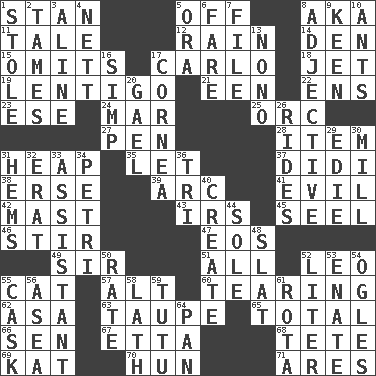 ACROSS 1. Comedian Laurel of Laurel & Hardy 5. Below a satisfactory level 8. Alias (abbr.) 11. Lie 12. Water falling in drops from the sky 14. Lair 15. Leaves out 17. Monte _, Las Vegas Hotel/Casino 18. Type of plane 19. Small, flat, pigmented spot on the skin 21. Car or cant ending 22. Followers of ems 23. Compass dir. 24. Spoil 25. The grampus (Milton) 27. Writing instrument 28. A distinct part 31. Pile 35. Allow 37. "You Light Up My Life" star Conn 38. Celtic language 39. Curve 41. Morally bad or wrong 42. Vertical spar for supporting sails 43. Big collection agency 45. Sew up the eyelids of hawks and falcons 46. Agitate 47. Greek goddess of the dawn 49. Title for a knight 51. Everything 52. Lion 55. Feline 57. Keyboard modifier key 60. Pulling into pieces 62. White ___ sheet 63. Grayish beige 65. "_____ Recall" 66. Elected rep. 67. Singer James 68. Wig 69. Krazy ___ of comics 70. Attila the _ 71. Ancient Greek god of war DOWN 1. Fur scarf 2. Domesticates 3. Place in a line 4. Remaining after all deductions 5. Mouth or opening 6. Conductor's collection 7. Do some clerical work 8. Descriptive word 9. Peachy ____! 10. Pismires 13. Words to Nanette 16. Simple or foolish person 17. Pupil covering 20. Highlander 26. Amusement-park features 29. Singer Brickell 30. Place where flour is made 31. Cloth borders 32. Part of Q.E.F. 33. Helper 34. _ dish (used to culture cells) 36. Three (prefix) 40. Cause to be 44. Not divided or shared with others 48. Narrow board 50. Pace 52. 61 cubic inches 53. Related on the mother's side 54. Stares 55. Keg 56. At sea 58. Thin strip of wood or metal 59. Ballerina skirt 61. Round or rotation of duties 64. Baking dish