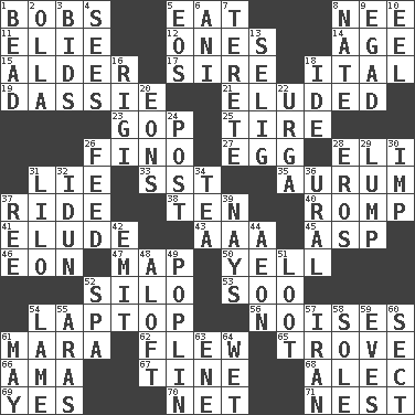 ACROSS 1. Moves up and down 5. Ingest 8. Born 11. Writer Wiesel 12. Singles 14. Mature 15. Tree or shrub in the Birch family 17. Title for a man of rank and authority 18. Slanted text style (abbr.) 19. Small ungulate mammals of Africa 21. Evaded 23. Republican Party 25. Hoop that covers a wheel 26. A pale, very dry sherry 27. Ovum 28. Biblical high priest 31. Falsehood 33. Fast jet (abbr.) 35. Gold (Symbol: Au) 37. Travel on or in a vehicle 38. "___ Little Indians" 40. Play 41. Dodge 43. American Automobile Association (abbr.) 45. Cleo's killer 46. Age 47. Atlas unit 50. Shout 52. Grain storage tower 53. "Barney Miller" actor Jack 54. Portable computer 56. Annoying sounds 61. Hindu Mythology: god of death 62. Soared 65. Collection of objects 66. Nanny (var.) 67. Prong on a fork 68. Actor Baldwin 69. Consenting reply 70. Fish or hair follower 71. Egg locale DOWN 1. Necklace unit 2. Water jar 3. Auction offers 4. Perceives with the eye 5. Greek goddess of the dawn 6. Cuckoo 7. Cigar-shaped 8. Nathan's nickname 9. Mild oath 10. Snakelike fish 13. Major League Baseball Commissioner Bud 16. Swiss mountan, "Queen of the Mountains" 18. Binary compound 20. Immeasurably long periods of time 22. Capital and largest city of Mongolia 24. Mail 26. Nourish 28. Greek god of love 29. Mass 30. Naughty child 31. _ and Stitch 32. Goddess of spring and wife of Bragi 34. Afternoon social gathering 36. Mountain range 37. To riddle 39. Negative votes 42. Send forth 44. Age 48. At or to great height 49. Cotton for raincoats, e.g. 51. Spoils 52. Health resort 54. Unable to walk 55. Caspian sea tributary 57. SW Asia republic 58. Flatfish 59. Nights before holidays 60. Religious group 61. Can I? 63. Compass dir. 64. Dripping