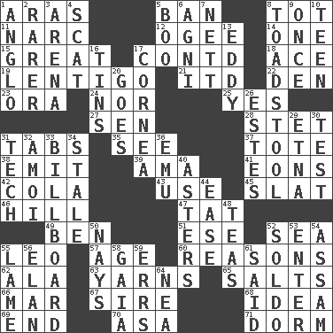 ACROSS 1. Ancient river in northeast Turkey 5. Prohibit 8. Small child 11. Drug cop 12. Double curve, resembling the letter S 14. Single 15. Relatively large 17. Continued (abbr.) 18. Adept person 19. Small, flat, pigmented spot on the skin 21. It would 22. Lair 23. Mouth or opening 24. And not 25. Consenting reply 27. Elected rep. 28. Proofreading order 31. Bar bills 35. Perceive with the eye 37. Haul 38. Give off 39. Housemaid (var.) 41. Immeasurably long periods of time 42. Root beer relative 43. Purpose 45. Narrow board 46. Land elevation 47. Make lace 49. Benjamin's nick name 51. Compass dir. 52. Ocean 55. Lion 57. Ripen 60. Thinks logically 62. According to 63. Entertaining tales 65. Table seasonings 66. Spoil 67. Father 68. The content of cognition 69. Conclusion 70. White ___ sheet 71. Dormintory (informal) DOWN 1. White American of non-Hispanic descent 2. Less widely known 3. Sports stadium 4. Scram! 5. Sometimes accompanies a hiss 6. Hindu god of fire 7. Remaining after all deductions 8. Inedible or poisonous agaric 9. At one time in the past 10. Adolescent 13. Whirlpool 16. Canisters 17. Pupil covering 20. Travels 26. _____ Park, CO 29. Inactive volcano in Sicily 30. Trial 31. Georgia ____ (Atlanta school) 32. Mine, in Marseilles 33. Big road sign 34. Showing deterioration from age 36. Australian flightless bird 40. Michaelmas daisies 44. Relaxation 48. Afternoon social gatherings 50. Negative votes 52. Twentieth part of a lira 53. Keyboard key 54. Indian state 55. Unable to walk 56. Liveliness 58. Greek goddess of the earth (variant) 59. Blunders 61. Expressed in words 64. Teachers' org.