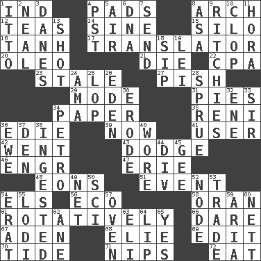 ACROSS 1. Working for oneself (abbr.) 4. Groovy apts. 8. Bowlike part 12. Afternoon social gatherings 14. Trig term 15. Grain storage tower 16. Hyperbolic tangent 17. Interpreter 20. Butter sub 21. Expire 22. Numbers guy (abbr.) 23. Having lost freshness 27. Expression of disdain 29. Method 31. Sliced desserts 34. Some stationery 35. Painter Guido (1575-1642) 36. Singer Brickell 39. At this time 41. One who makes use of a thing 42. Left 43. Evade 46. Engineer (abbr.) 47. One of the Great Lakes 48. Immeasurably long periods of time 51. Incident 54. Raised railways 56. Environmental prefix 58. NW Algerian seaport 61. Rotating or pertaining to rotation 66. Have the gumption 67. An important port of Yemen 68. Writer Wiesel 69. Prepare for publication 70. Periodic rise and fall of the sea level 71. Pinches, bites 72. Consume DOWN 1. "Tell ____ the Marines!" 2. Actress Patricia 3. Natives or inhabitants of Denmark 4. Pacific Standard Time (abbr.) 5. Wind 6. Heredity factor (abbr.) 7. Post 8. White ___ sheet 9. Actors Guy, Robert Welles, and Clint 10. Hoof sound 11. Israeli folk dance 13. Opportunity 18. Small drink 19. Luau accessory 24. Nanny (var.) 25. Chop off 26. Paradise 28. Disorder 30. Eat (away) 32. Compass dir. 33. Title for a knight 34. Stone: prefix 36. She-sheep 37. Lair 38. Consumed 40. Had on 44. HTML Container Element 45. Turn to the right 49. Fish or hair follower 50. _-fi 52. Thickened enlargement 53. Swap 54. Part of Q.E.F. 55. Farming town in central California 57. Baking chamber 59. Roberta Peters solo 60. Remaining after all deductions 62. One (Scot) 63. Connecticut Ivy Leaguer 64. Mouth edge 65. It is so