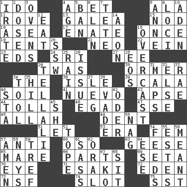 ACROSS 1. Wedding promise 4. Collude with 8. Wing 11. Be footloose 13. An organ shaped like a helmet 15. Lower and raise head in agreement 16. Toward the sea 17. Maternal 18. Single time 19. Portable shelters 21. Modern: prefix 22. Distinctive style or manner 23. Begley and Asner 24. _ Lanka 27. Born 29. It was, poetically 30. Abalone 34. Definite Article 36. Small island 39. Any of the three canals of the cochlea 40. Earth 41. New (sp.) 43. Domed church section 44. For Whom the Bell _____ 46. Mild oath 47. Compass dir. 48. Assad's deity 49. Scratch 51. Allow 53. Period 54. Opposite of masc. 57. Opposed to 60. Bear (Spanish) 63. Honkers 65. Female horse 66. Actors' quests 69. Bristle 70. Sight organ 71. 1973 Nobel Price Winner (Physics) Leo 72. Locale of original sin 73. Science/research agcy. 74. Narrow opening 75. Fast jet (abbr.) DOWN 1. Feeling or showing extreme anger 2. Administered medicine 3. Baking chambers 4. Mature 5. Prohibit 6. Liveliness 7. Wig 8. Singer Murray 9. Locales 10. Arabian gulf 12. Erode 14. Period of immesurable duration 18. Cloudy 20. Compass dir. 25. Precipitation 26. Come out of 28. Greek goddess of the dawn 29. Copy Pinocchio 31. Atlas contents 32. Otherwise 33. Actress Charlotte 34. Utensil 35. Land elevation 37. Part of a journey 38. Elude 40. R.R. building 42. River in Europe 45. A female animal or person 50. Tired old horse 52. Drink excessively 54. Eats 55. _____ Park, CO 56. Intended 57. So be it 58. Negative votes 59. Not kosher 61. Backtalk 62. Taken by mouth 64. Compass dir. 67. Ring climax 68. Be seated