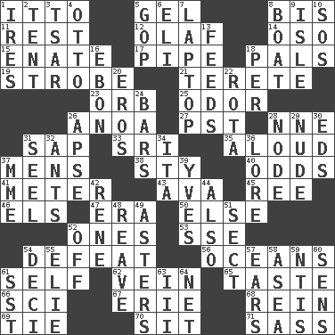 ACROSS 1. "Tell ____ the Marines!" 5. Set 8. Again 11. Remainder 12. Norwegian king 14. Bear (Spanish) 15. Maternal 17. Corncob 18. Friends 19. Disco prop 21. Cigar-shaped 23. Globe 25. Scent 26. Small Philippine buffalo 27. Pacific Standard Time (abbr.) 28. Compass dir. 31. Plant excrement 33. Indian title of respect (Mr.) 35. Verbally 37. Not women's 38. Filthy place 40. Likelihood 41. Distance measurement 43. Actress Gardner 45. To separate or throw off 46. Raised railways 47. Period 50. Otherwise 52. Singles 53. Compass dir. 54. Outscore 56. Seas 61. Automatic 62. Distinctive style or manner 65. Clothes sense 66. _-fi 67. 4th largest of the Great Lakes 68. It's straight from the horse's mouth 69. Neckwear 70. Be seated 71. Backtalk DOWN 1. Angers 2. Portable shelter 3. Russian ruler of old 4. "Beetle Bailey" pooch 5. Grand Old Party 6. Connecticut Ivy Leaguer 7. Portable computer 8. Water vessel 9. Small island 10. Mayday 13. Gives food to 16. Inky black, to poets 18. For each 20. Greek god of love 22. Round or rotation of duties 24. Soap units 26. Domed church section 28. Connecting point 29. Naked 30. Begley and Asner 31. Sew up the eyelids of hawks and falcons 32. Pismires 34. Call ___ day 36. Old wives' tales, e.g. 37. Madame (abbr.) 39. Jacques Cousteau's middle name 42. French philosopher Descartes 44. In addition 48. Break or tear apart 49. Michaelmas daisies 51. Religious group 52. No longer planned or scheduled 54. Tenth: prefix 55. Writer Wiesel 57. Hearing organs 58. Toward the sea 59. Nuclear Threat Initiatives 60. Elected reps. 61. Fast jet (abbr.) 63. One more than two 64. Fish or hair follower