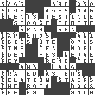 ACROSS 1. Droops 5. "We ___ not amused" (Victoria) 8. Bear (Spanish) 11. _ gin 12. Matures 13. Tired old horse 14. Chooses 17. A testis 19. Moe Howard, for one 21. Cigar-shaped 22. Coast Guard woman 23. Ocean 24. Infant locale 27. Greek god of love 29. Cuckoo 32. Off-Broadway awards 34. Shoshoni 36. Musical composition 37. Trig term 38. Beverage made from leaves 39. Christmas carol 40. Genesis locale 41. It is so 42. Effrontery 43. Marina Del _, California 44. San ____ (Riviera town) 46. Small child 47. Nursemaid (var.) 50. Austrian-born American filmmaker Fritz 52. Spoke pompously 55. Michaelmas daisies 57. Conveyance 59. Flight of steps 62. Compass dir. 63. Round or rotation of duties 64. Scornful sounds 65. Portuguese money of account (variant) 66. Eastern Standard Time (abbr.) 67. Overwhelm DOWN 1. Compass dir. 2. Everything 3. Moves 4. Religious groups 5. Ripen 6. Musical pauses 7. First name in cosmetics 8. Single time 9. Table seasoning 10. Double curve, resembling the letter S 12. Had dinner 15. Drinks excessively 16. Fly high 18. Lyricist Gershwin 20. Cross 24. Failure 25. Remain 26. Abounding in pines 28. Navigate 29. To the left, to Queeg 30. New (sp.) 31. Small island 33. Car or cant ending 35. Artist's stands 36. Single 42. Music written for nine 45. Floor protectors 47. "One Day ___ Time" 48. Distance measurement (Brit.) 49. Goodbye (Sp.) 51. Takes hold of 52. Baltic tributary 53. French philosopher Descartes 54. Toward shelter 55. Santa ___, CA 56. The Jewish people; Israel 58. Baseball player Mel 60. Friend of Pooh 61. Compass dir.