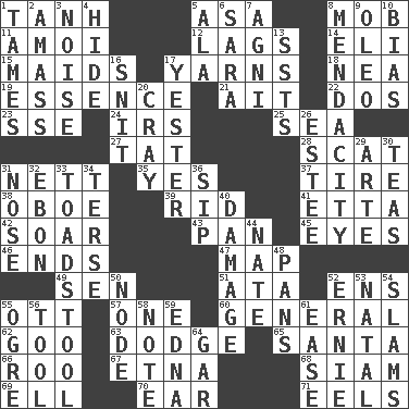ACROSS 1. Hyperbolic tangent 5. White ___ sheet 8. Crowd into 11. Mine, in Marseilles 12. Fails to keep up a pace 14. Connecticut Ivy Leaguer 15. Women servants 17. Tall tales 18. Teachers' org. 19. Substance 21. Small island 22. Two (Sp.) 23. Compass dir. 24. Big collection agency 25. Ocean 27. Make lace 28. Leave at once 31. Remaining after all deductions 35. Consenting reply 37. Hoop that covers a wheel 38. Mitch Miller's instrument 39. To free from 41. Singer James 42. Fly high 43. Baking dish 45. Sight organs 46. Conclusions 47. Atlas unit 49. Elected rep. 51. "One Day ___ Time" 52. Followers of ems 55. Baseball player Mel 57. Single 60. Commissioned military rank 62. Thick or sticky substance 63. Evade 65. Before Barbara or Clara 66. Friend of Pooh 67. Inactive volcano in Sicily 68. Thailand, formerly 69. Pipe bend 70. Ewer handle 71. Snakelike fish DOWN 1. Softens 2. Collect or gather 3. Annoying sound 4. Flintstone garb 5. Wing 6. "Two Mules for Sister ____" 7. Hindu god of fire 8. Ananias' fault 9. Margarine 10. Prejudice 13. Fast planes 16. In a ____ (agitated or irritated) 17. Last past 20. Supercomputer manufacturer 26. First name in cosmetics 29. Johnson of "Laugh-In" 30. Afternoon social gatherings 31. Characteristic smell of wine 32. Inky black, to poets 33. Inedible or poisonous agaric 34. Laconic 36. Small drink 40. Break 44. Nathan's nickname 48. Zero-star reviews 50. Thickened enlargement 52. Bert's buddy 53. Relating to or accompanying birth 54. Shuts with force 55. Legendary monster 56. Instrument 58. Musical sound 59. Pulitzer Prize-winning author Ferber 61. Comfort 64. Slender fish