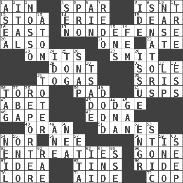 ACROSS 1. Direct toward a target or goal 4. Practice fight 8. Is not 12. Portico 14. 4th largest of the Great Lakes 15. Letter starter 16. Compass direction 17. Unrelated to defense, as in spending 20. In addition 21. Single 22. Had dinner 23. Leaves out 27. Stricken, poetically 29. Do not 31. Flatfish 34. Ancient Roman robes 35. Indian titles of respect 36. "Corrida" creature 39. Writing tablet 41. United States Postal Service (abbr.) 42. Collude with 43. Evade 46. Stare wonderingly 47. Pulitzer Prize-winning author Ferber 48. Northwest Algerian city 51. Natives or inhabitants of Denmark 54. Or not 56. Born 58. Nuclear Threat Initiatives 61. Pleas 66. Went 67. The content of cognition 68. Metal containers 69. Travel on an animal 70. Old wives' tales, e.g. 71. Assistant 72. Police officer (slang) DOWN 1. Toward the sea 2. Slanted text style (abbr.) 3. With motion or animation 4. Elected rep. 5. Adept person 6. The 18th letter of the Arabic alphabet 7. Redecorate 8. Binary compound 9. Legislators 10. Political cartoonist Thomas 11. Woody plant 13. Tiny particle 18. Followers of ems 19. Opposite of masc. 24. Wedding promise 25. Coat; cloak 26. Fastener 28. Come out of 30. Sadhe (variant) 32. Mouth edge 33. Double-curved letter 34. Carrier 36. Label 37. Chief or king in Benin or Nigeria 38. News announcer 40. Texas town _ City 44. Heredity factor (abbr.) 45. Separate the seeds from cotton 49. One (Scot) 50. Teachers' org. 52. Engineer (abbr.) 53. Unemotional 54. Famous astronaut Armstrong 55. Southwest Nigerian state 57. Singer James 59. Southeast Asian peninsula 60. Ooze 62. Actress Charlotte 63. One more than two 64. Conclude 65. Compass dir.