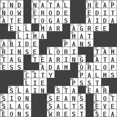 ACROSS 1. Working for oneself (abbr.) 4. Brizilian seaport 9. Pile 13. At this time 14. Wear away 15. Prepare for publication 16. Had dinner 17. Ancient Roman robes 18. Opera by Verdi 19. Pipe bend 21. Impair 22. Match 24. Pale green bean 26. Floor covering 27. Remain 29. Zero-star reviews 30. Remove soap 31. Australian parrot (variant) 33. Scottish cap 36. Label 37. Lacerating 40. "One Day ___ Time" 41. Double-curved letter 42. First of billions? 43. Lowest deck of a ship 45. Municipality 47. Insides of hands 48. Untruth 49. Inconspicuous attention getter 50. Killed 52. R.R. building 54. Hearing organ 56. The Jewish people; Israel 57. Seines 59. Car dealer's back yard 61. Volcanic refuse 62. Table seasonings 63. Night before a holiday 64. Immeasurably long periods of time 65. Obtain by seizing forcibly or violently 66. Ocean DOWN 1. _ tizzy (2 wds.) 2. Short letter 3. Residences 4. Fish or hair follower 5. Scent 6. Ancient Roman robe 7. The sixth month of the Jewish calendar 8. French article 9. Centers 10. Singer Brickell 11. Helper 12. Parent Teacher Association (abbr.) 20. Hats (slang) 22. With great haste 23. Separate the seeds from cotton 25. Rendezvous 27. Johnson of "Laugh-In" 28. Prejudice 29. Demure 31. Kenny Rogers chart-topper in '80 32. Mouth or opening 33. Baron Munchausen's specialties 34. Tiny particle 35. Atlas contents 38. Eroded 39. Republicans 44. Raze (variant) 45. Gives out a loud, resonant sound 46. One more than two 49. Leg coverings 50. Grain storage tower 51. Grant temporary use of 52. Singe 53. Lie 55. Be footloose 56. Compass dir. 57. Compass dir. 58. Fast jet (abbr.) 60. Beverage made from leaves