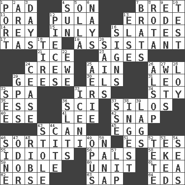 ACROSS 1. Groovy apt. 4. Male child 7. Cy Young winner Saberhagen 11. Mouth or opening 12. Monetary unit of Botswana 13. Wear away 14. Marina Del _, California 15. Inwardly 16. Chalkboards 17. Clothes sense 19. Helper 21. Frozen water 23. Ripens 24. Ship's personnel 25. The 18th letter of the Arabic alphabet 26. Leather borer 29. Honkers 30. Raised railways 31. Lion 32. Health resort 33. Big collection agency 34. Filthy place 35. Double-curved letter 36. _-fi 37. Grain storage towers 40. Compass dir. 41. Area sheltered from the wind 42. Fastener 43. Glance over 45. Oval reproductive body of a fowl 46. Conclusion 51. _____ Park, CO 55. Foolish or stupid persons 56. Friends 58. Supplement with great effort 59. Impressive in appearance 60. A single undivided whole 61. Afternoon social gathering 62. Celtic language 63. Plant excrement 64. Begley and Asner DOWN 1. Left side of a ship or aircraft 2. Length times width 3. 24-hour periods 4. Player for Phoenix 5. Spanish pot 6. Negative votes 7. Naughty children 8. Roll call or roster of names 9. Genesis locale 10. Trial 12. Components 13. Otherwise 16. Public displays of written messages 18. Hoop that covers a wheel 20. Moves on water 22. She-sheep 24. Desist 25. Nest on high 26. Columnist Joseph or Stewart 27. Soaks 28. Myrna of the movies 29. Global Positioning Systems (abbr.) 32. Perceive with the eye 33. Ancient Celtic tribe of eastern Britain 36. Narrow boards 37. Compass dir. 38. Consume 39. Falls behind 43. Fur scarf 44. Quote 46. Trig term 47. Aroma 48. Teases 49. Musical composition 50. Grandmother 52. False hair 53. Made supply last 54. Oceans 57. Mouth edge