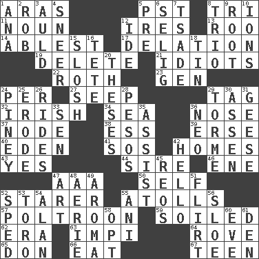 ACROSS 1. Caspian sea tributary 5. Pacific Standard Time (abbr.) 8. Three (prefix) 11. Part of speech 12. Angers 13. Friend of Pooh 14. Most capable 17. Accusation by an informer 19. Erase 21. Foolish or stupid persons 22. Writer of Portnoy's Complaint (1969) 23. Commissioned military rank (abbr.) 24. For each 27. Ooze 29. Label 32. From or relating to Ireland 34. Ocean 36. Sense of smell 37. Thickened enlargement 38. Double-curved letter 39. Celtic language 40. Locale of original sin 41. Mayday 42. Dwellings 43. It is so 44. Father 46. Compass dir. 47. Auto club (abbr.) 50. Automatic 52. A viewer who gazes fixedly 55. Ringlike coral islands and reefs 57. Coward 59. Dirtied 62. Epoch 63. Body of Kaffir warriors 64. Be footloose 65. Spanish title 66. Erode 67. Adolescent DOWN 1. Santa ___, CA 2. Director Reiner 3. Old (Scot.) 4. Contemptuous expression 5. Before (prefix) 6. Major League Baseball Commissioner Bud 7. Sadhe (variant) 8. Musical group of three 9. Carrot, for example 10. Charged atoms 12. Binary compound 15. Splash clumsily 16. Wig 18. Shallow baking pan 20. College papers 24. Abounding in pines 25. Eat (away) 26. Amusement-park features 28. Mexican monetary units 29. Singer Mel 30. NE Netherlands city 31. Honkers 33. Elected rep. 35. Help 36. Modern: prefix 42. Phone greeting 45. Vintage cars 47. Nonscientific branch of learning 48. Nest on high 49. Scent 51. Seductive woman who exploits men 52. Hurried 53. "Corrida" creature 54. Actor Alda or Thicke 55. Black tropical American cuckoo 56. _ gin 58. Elect 60. Night before a holiday 61. Lair