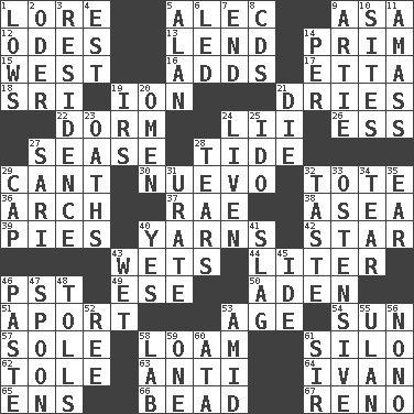 ACROSS 1. Old wives' tales, e.g. 5. Actor Baldwin 9. White ___ sheet 12. Lyric poems 13. Grant temporary use of 14. Demure 15. Compass direction 16. Does sums 17. Singer James 18. Indian title of respect (Mr.) 19. Electrically charged atom 21. Frees from moisture 22. Dormintory (informal) 24. Cards in a Roman deck? 26. Curvy letter 27. Gospel singer Marvin 28. Event that recurs at intervals 29. Patter 30. New (sp.) 32. Lug 36. Bowlike part 37. Actress Charlotte 38. Toward the sea 39. Sliced desserts 40. Entertaining tales 42. Play the lead 43. Moistens 44. 61 cubic inches 46. Pacific Standard Time (abbr.) 49. Compass dir. 50. Arabian gulf 51. To the left, to Queeg 53. Personal question 54. Player for Phoenix 57. Flatfish 58. Rich soil 61. Grain storage tower 62. Lacquered or enameled metalware 63. Opposed to 64. "Terrible" tsar 65. Followers of ems 66. Necklace unit 67. Western Nevada city DOWN 1. Moos 2. River in Europe 3. Dwelling 4. Eastern Standard Time (abbr.) 5. Actor Alda or Thicke 6. Directed 7. Conclusion 8. Music discs 9. Nick name for Arthur 10. Locates 11. Collect or gather 14. For each 19. Big collection agency 20. Presage 21. Pass on 23. Expletives 24. Make or become more lively 25. Wedding promise 27. Indian skirt 28. Pulls apart 29. Head covering 31. A salt of uric acid 32. Clothes sense 33. Clearly or manifestly demonstrative 34. Pull into pieces 35. Ewer handle 40. Consenting reply 41. Volcanic refuse 43. Soggy 45. Binary compound 46. Thick mixture 47. Soup utensil 48. For Whom the Bell _____ 52. To sift 53. Among 55. ____ Bator, Mongolia 56. Words to Nanette 58. Experiment locale 59. Single 60. _ moment's notice (2 wds.) 61. Title for a knight