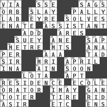 ACROSS 1. By way of 4. Compass dir. 7. Sinks 11. Globe 12. Kill 13. Chummy 14. Experiment locale 15. Jane of fiction 16. Finds the solution 17. Maternal 19. Helper 21. Find the sum of 23. Ancient Greek god of war 24. Chop _ 25. A saturated hydrocarbon 26. Plant excrement 29. Distance measurement (Brit.) 30. Mountains (abbr.) 31. Santa ___, CA 32. For each 33. American Automobile Association (abbr.) 34. Small boy 35. Title for a knight 36. Medical imaging device (abbr.) 37. Showery time 40. _ tizzy (2 wds.) 41. The 18th letter of the Arabic alphabet 42. Within a short period 43. Globular water bottle used in Asia 45. Fitting 46. Dwelling 51. Learning spot: Fr. 55. Speaker 56. "If ____ say so..." 58. Separate the seeds from cotton 59. Carrier 60. Hoop that covers a wheel 61. To free from 62. SW Saudi Arabia district 63. And so on (abbr.) 64. Followers of ems DOWN 1. Short-tailed, large-bodied rat 2. SW Asia republic 3. Swedish rock group 4. Secret 5. "Two Mules for Sister ____" 6. Sight organs 7. Table seasonings 8. Inventor's middle name 9. Small, secluded valley 10. System (abbr.) 12. Sowing specialist 13. Airs 16. Begets 18. Pulled tight 20. Before Barbara or Clara 22. Color 24. Father Junipero _ 25. With great haste 26. Smooth fabric 27. Of or related to the anus 28. Groovy apt. 29. Chow _ 32. Air pressure measure (abbr.) 33. Believer in; advocate of (suffix) 36. Mother 37. White ___ sheet 38. Wimpy's pal 39. College mil. group 43. 61 cubic inches 44. Scent 46. Roll call or roster of names 47. Greek god of love 48. Suttee (variant) 49. Quote 50. Send forth 52. Legendary monster 53. (Had) reclined 54. Extremities 57. Curve