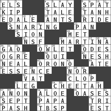 ACROSS 1. Raised railways 4. Kill 8. Argument over a trivial matter 12. Sleep 13. Lie 14. Hyperbolic tangent 15. Peak District village in England 18. Pismires 19. Travel on or in a vehicle 20. Catching in a trap 22. Baking dish 23. The Jewish people; Israel 24. Was introduced to 25. Science/research agcy. 26. Chrissie's court nemesis 30. E Mali city 33. A small or young owl 36. Lyric poems 37. Legendary monster 39. Fr. "Yes" 40. Tender 41. Anneal 42. U. of Maine site 44. Had dinner 45. Core 47. And not 50. Large container 51. Hoof sound 53. Part of a journey 54. Leopard's kin 57. Soon (poet.) 59. Medicinal plant 61. Fertile tracts in a desert 63. Back-to-school mo. 64. Dad 65. Three (prefix) 66. Romantic infatuation 67. Cook's measure (abbr.) 68. Eastern Standard Time (abbr.) DOWN 1. Supplement with great effort 2. Hats (slang) 3. Connects, as a bridge 4. Comedian Laurel of Laurel & Hardy 5. Long (Scottish) 6. The first octave above the treble staff 7. It is so 8. Ski resort town in Vermont 9. Ache 10. Added to 11. Definite Article 16. (Had) reclined 17. Greek god of love 21. Information 22. For each 24. Floor covering 26. Count _ (2 wds.) 27. It may be bright or harebrained 28. Egg locale 29. American tennis player Robert 30. Went 31. Eons 32. Mouths or openings 34. Had on 35. Nilotic language 38. Veterans Day date 42. Sep. follower 43. Single time 46. Tired old horse 48. Butter sub 49. Round or rotation of duties 52. Thick mixture 53. Chops off 54. 911 reaches them 55. Pile 56. Possessive pronoun 57. Cleo's killer 58. Teachers' org. 59. Fitting 60. Experiment locale 62. Be seated
