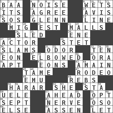 ACROSS 1. Sound made by sheep 4. Annoying sound 9. Soaks 13. It is 14. Match 15. Deliberation 16. Mayday 17. American astronaut and politician John 18. Actor's bit 19. Russian fighter aircraft 21. Eastern Standard Time (abbr.) 22. Promenades 24. Downhill vehicle 26. Compass dir. 27. Thespian 29. Proofreading order 30. Criticizes harshly 31. Aroma 33. Nine, plus one 36. Age 37. Shoved, as through a crowd 40. Mouth or opening 41. Fitting 42. Immeasurably long periods of time 43. At full speed 45. Not wild 47. Cowboy competition 48. Australian flightless bird 49. Confederate soldiers (slang) 50. Ethiopian city, capital of Harari 52. A female animal or person 54. R.R. building 56. Ubangi River tributary 57. Forward in time 59. Choose 61. Back-to-school mo. 62. Boldness 63. Bear (Spanish) 64. Otherwise 65. NE Netherlands city 66. Allow DOWN 1. Again 2. Smallest unit of an element 3. Aide 4. Tired old horse 5. Stared 6. Angers 7. Emitted 8. Car or cant ending 9. Place for singles 10. Tending to cause great harm 11. Airtight sealed metal containers 12. Compass dir. 20. Take by theft 22. Distance measurement (Brit.) 23. One (Scot) 25. Celtic language 27. At sea 28. Hoof sound 29. Sty mamas 31. Mitch Miller's instrument 32. Spanish title 33. Inedible or poisonous agaric 34. 4th largest of the Great Lakes 35. Billionth: prefix 38. Arboreal primate 39. Have the gumption 44. Disorderly crowds 45. Cylindrical with tapered ends 46. Housemaid (var.) 49. Rob, plunder, or pillage 50. The bottom of a shoe or boot 51. High mountains 52. "______ My Girl" (Turtles hit) 53. Possessive pronoun 55. Domed church section 56. Purpose 57. Santa ___, CA 58. Lair 60. Small child