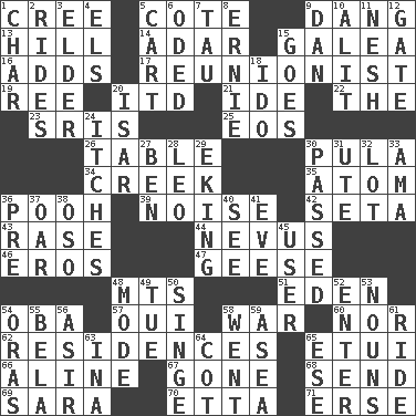 ACROSS 1. Algonquian 5. ____ d'Azur (French Riviera) 9. Mild oath, euphamism for damn 13. Land elevation 14. The sixth month of the Jewish calendar 15. An organ shaped like a helmet 16. Does sums 17. One who advocates reunion 19. To sift 20. It would 21. Binary compound 22. Definite Article 23. Indian titles of respect 25. Greek goddess of the dawn 26. Eating place 30. Monetary unit of Botswana 34. Small stream 35. Tiny particle 36. "Silly old bear" 39. Annoying sound 42. Bristle 43. Raze (variant) 44. Mole, birthmark 46. Greek god of love 47. Honkers 48. Mountains (abbr.) 51. Paradise 54. Chief or king in Benin or Nigeria 57. Fr. "Yes" 58. Armed conflict 60. And not 62. Dwellings 65. Needle case 66. Place in a line 67. Went 68. Post 69. "Two Mules for Sister ____" 70. Singer James 71. Celtic language DOWN 1. Burn to charcoal 2. Amusement-park features 3. A person who is older than you are 4. Raised railways 5. Draw slowly or heavily 6. Wrote a lyric poem 7. The 19th letter of the Greek alphabet 8. Bert's buddy 9. One of the 12 tribes of Israel 10. Came down and settled, as after flight 11. Tender 12. Yard entry 15. Leaves 18. Wedding promise 20. Austrian river, tributary to the Danube 24. Irritating cutaneous sensations 27. Benjamin's nick name 28. Lion 29. Supplementing with great effort 30. Went by 31. Shoshoni 32. Car dealer's back yard 33. Wet nurse (var.) 36. Before (prefix) 37. Rowing implement 38. Bear (Spanish) 40. Perceive with the eye 41. Night before a holiday 45. One who uses or employs something 48. Method 49. Third day of the wk. 50. Scorch 52. Keyboard key 53. Parts of speech 54. Mouths or openings 55. Actor Lugosi 56. SW Saudi Arabia district 58. Gone 59. At sea 61. Travel on an animal 63. _ tizzy (2 wds.) 64. Small bed 65. Compass dir.