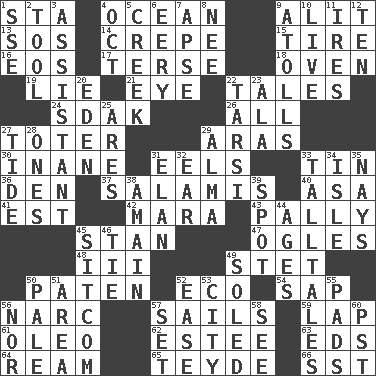 ACROSS 1. R.R. building 4. Sea 9. Set down 13. Distress signal 14. Streamer paper 15. Become fatigued 16. Greek goddess of the dawn 17. Laconic 18. Baking chamber 19. Untruth 21. Sight organ 22. Stories 24. Neighbor of Neb. 26. 100% 27. Carrier 29. Ancient river in northeast Turkey 30. Lacking in sense or substance 31. Snakelike fish 33. Metal container 36. Lair 37. Deli grouping 40. White ___ sheet 41. Eastern Standard Time (abbr.) 42. Hindu Mythology: god of death 43. Chummy 45. Comedian Laurel of Laurel & Hardy 47. Stares at amorously 48. One more than two 49. Proofreading order 50. Eucharist need 52. Environmental prefix 54. Plant excrement 56. Drug cop 57. Moves on water 59. Infant locale 61. Butter sub 62. First name in cosmetics 63. Begley and Asner 64. 480, 500 or 516 sheets of paper 65. Miss Universe 1986, Barbara Palacios _ 66. Fast jet (abbr.) DOWN 1. Compass dir. 2. Utensil 3. Aide 4. Sep. follower 5. Small stream 6. Suggestive of the supernatural 7. Domed church section 8. Born 9. Ringlike coral islands and reefs 10. Not recorded 11. Angers 12. Nine, plus one 20. Genesis locale 22. Tarsus (plural) 23. Wing 25. Ancient Greek god of war 27. Periodic rise and fall of the sea level 28. Singles 29. _ mater 31. Liveliness 32. Ewer handle 33. Baron Munchausen's specialties 34. Small island 35. Negative votes 38. With great haste 39. Specific locale 44. Ripens 45. "Cheers" or "Ellen" 46. Neckwear 49. Having a sole or soles 50. Light colored 51. Type of rug 52. Comfort 53. Municipality 55. Groovy apts. 56. And not 57. Put into a specified state 58. Observe 60. Pacific Standard Time (abbr.)