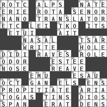 ACROSS 1. College mil. group 5. High mountains 9. Nathan's nickname 13. 4th largest of the Great Lakes 14. Roll call or roster of names 15. Sir (Sp.) 16. Billionth: prefix 17. Interpreter 19. And so on (abbr.) 20. Luau accessory 21. Ring climax 22. ___ a Wonderful Life 23. Needle case 25. Small island 26. Relating to the nose 30. Russian ruler of old 34. Compose 35. Hollow 36. "You Light Up My Life" star Conn 39. All-night dance parties 42. Hero or heavy, e.g. 43. Scent 44. First name in cosmetics 46. Sense of smell 47. Rob, plunder, or pillage 48. Australian flightless bird 51. Son of Isaac 54. Sep. follower 57. Separate the seeds from cotton 58. Raised railways 60. Followers of ems 62. Conciliate 65. Roberta Peters solo 66. Ancient Roman robes 67. Canisters 68. "Vaya con ____" 69. Connect, as a bridge 70. Part of Q.E.F. 71. Hiding places for outlaws DOWN 1. French philosopher Descartes 2. Declaim 3. Colored lightly or faintly 4. Corporate head (abbr.) 5. Johnson of "Laugh-In" 6. Australian parrot (variant) 7. Parent Teacher Association (abbr.) 8. Before Barbara or Clara 9. Teachers' org. 10. Against 11. A blast of a horn 12. Blunders 15. Narrow, elongated depression 18. What Jean-Claude Killy likes to do 20. One who doesn't tell the truth 24. Undo the wiring of 27. Title for a knight 28. "One Day ___ Time" 29. Crowbar 30. Threesomes 31. "Barney Miller" actor Jack 32. Everything 33. To separate or throw off 36. Spanish title 37. Wedding promise 38. Two (Sp.) 40. Compass dir. 41. R.R. building 45. Nights before holidays 48. The front part of a cuirass 49. Floor covering 50. Join together 52. Nest on high 53. The state of being joined or united 54. Chooses 55. Riding implement 56. Ancient Roman robe 58. Inactive volcano in Sicily 59. For fear that 61. Backtalk 63. Baking dish 64. Atmosphere 65. Increase
