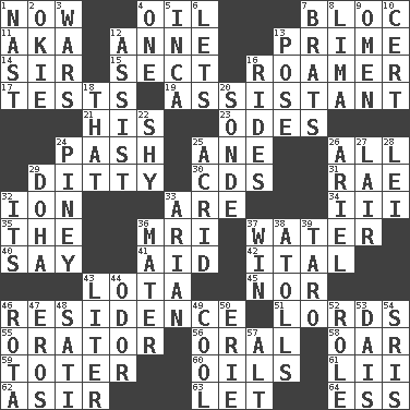 ACROSS 1. At this time 4. Lubricate 7. Group of countries in special alliance 11. Alias (abbr.) 12. Singer Murray 13. First class 14. Title for a knight 15. Religious group 16. Wanderer 17. Trials 19. Helper 21. Part of HMS, perhaps 23. Lyric poems 24. Romantic infatuation 25. A saturated hydrocarbon 26. 100% 29. Short, simple song 30. Music discs 31. Actress Charlotte 32. Electrically charged atom 33. "We ___ not amused" (Victoria) 34. One more than two 35. Definite Article 36. Medical imaging device (abbr.) 37. Wetness 40. Declare 41. Assist 42. Slanted text style (abbr.) 43. Globular water bottle used in Asia 45. And not 46. Dwelling 51. Nobles 55. Speaker 56. Taken by mouth 58. Rowing implement 59. Carrier 60. Petroleums 61. Cards in a Roman deck? 62. SW Saudi Arabia district 63. Allow 64. Curvy letter DOWN 1. Political cartoonist Thomas 2. Migrant worker of the '30s 3. Armed conflicts 4. Single 5. South American Indian 6. Allows 7. Naughty children 8. Pale green bean 9. Presage 10. An absolute certainty 12. Help 13. Introduce or present, as a question 16. Amusement-park features 18. Not this but _ 20. Message 22. Like a shrinking violet 24. Abounding in pines 25. Sour-tasting 26. Satellite of Uranus 27. Den 28. Flowery wreath 29. Capital of the state of Qatar 32. ___ a Wonderful Life 33. Believer in; advocate of (suffix) 36. Mother 37. Victory 38. Ringlike coral islands and reefs 39. Pacific island yam 43. 61 cubic inches 44. Scent 46. Round or rotation of duties 47. Greek god of love 48. Suttee (variant) 49. Calm and collected 50. One of the Great Lakes 52. Hero or heavy, e.g. 53. Raised platform 54. Indian titles of respect 57. The first octave above the treble staff