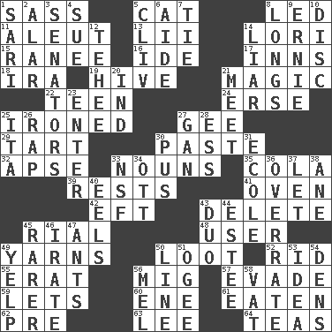 ACROSS 1. Backtalk 5. Feline 8. Directed 11. Eskimo relative 13. Cards in a Roman deck? 14. Australian parrot (variant) 15. The wife of a rajah (variant) 16. Binary compound 17. Lodging establishments 18. Lyricist Gershwin 19. Hub of activity 21. Mysterious quality of enchantment 22. Adolescent 24. Celtic language 25. Pressed 27. Turn to the right 29. Small pie 30. Thick mixture 32. Domed church section 33. Parts of speech 35. Root beer relative 39. Musical pauses 41. Baking chamber 42. Lizard (obsolete) 43. Erase 45. Monetary unit of Yemen 48. One who makes use of a thing 49. Entertaining tales 50. Spoils 52. To free from 55. Part of Q.E.F. 56. Russian fighter aircraft 57. Dodge 59. Allows 60. Compass dir. 61. Ingested 62. Before (prefix) 63. Area sheltered from the wind 64. Beverages made from leaves DOWN 1. Indian skirt 2. Having or resembling wings 3. Legislators 4. Take to court 5. 154 in Roman numerals 6. Helper 7. Neckwear 8. Yearns 9. Bert's buddy 10. Plate 12. Giggle 14. One who doesn't tell the truth 20. Indiana (abbr.) 21. Rendezvous 23. Keyboard key 25. Call ___ day 26. Reproach for some lapse or misdeed 27. Separate the seeds from cotton 28. Double-curved letter 30. Purulenc 31. Learning spot: Fr. 33. Overdraft (abbr.) 34. Baseball player Mel 36. Make much ado about nothing 37. Allow 38. One (Scot) 40. Snakelike fish 43. Superhero pair 44. First name in cosmetics 45. More valued for its uncommonness 46. Feeling or showing extreme anger 47. Pismires 49. Sharp bark 50. Actor's bit 51. Double curve, resembling the letter S 53. The main thing one is thinking about 54. Hiding places for outlaws 56. Cartoonist voice _ Blanc 58. Large container