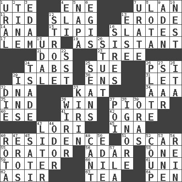 ACROSS 1. Shoshoni 4. Compass dir. 7. ____ Bator 11. To free from 12. Volcanic refuse 13. Eat (away) 14. Santa ___, CA 15. Native american tent (variation) 16. Chalkboards 17. Arboreal primate 19. Aide 21. Two (Sp.) 23. Woody plant 24. Bar bills 25. Institute legal proceedings 26. Air pressure measure (abbr.) 29. Small island 30. Followers of ems 31. Allow 32. Heredity factor (abbr.) 33. Krazy ___ of comics 34. Auto club (abbr.) 35. Working for oneself (abbr.) 36. Acquire through effort 37. Peter (Polish) 40. Compass dir. 41. Big collection agency 42. Legendary monster 43. Australian parrot (variant) 45. _ tizzy (2 wds.) 46. Home 51. Motion picture award 55. Speaker 56. The sixth month of the Jewish calendar 58. Single 59. Carrier 60. The longest river in the world 61. University (slang) 62. SW Saudi Arabia district 63. Beverage made from leaves 64. Fenced enclosure DOWN 1. Mountain range 2. Prong on a fork 3. Dutch treat 4. Connecticut Ivy Leaguer 5. California wine valley 6. Armor plate that protects the chest 7. A salt of uric acid 8. Globular water bottle used in Asia 9. An important port of Yemen 10. A home for chicks 12. Disco prop 13. Otherwise 16. Begets 18. Allodial 20. Check the growth or development of 22. Fast jet (abbr.) 24. Sadhe (variant) 25. Seines 26. Food holder 27. Dry up 28. Call ___ day 29. Lodging establishments 32. Expire 33. Japanese brewing company 36. One who wires 37. Luau course 38. Dismiss 39. Mouths or openings 43. 61 cubic inches 44. Aroma 46. Roll call or roster of names 47. Greek god of love 48. Suttee (variant) 49. Patter 50. Singer Brickell 52. Clever action or accomplishment 53. Singer Murray 54. It's straight from the horse's mouth 57. In the manner of