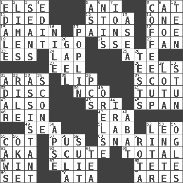 ACROSS 1. Otherwise 5. Cuckoo 8. Domesticated feline 11. Passed on 12. Portico 14. Single 15. With great haste 17. Aches 18. Enemy 19. Small, flat, pigmented spot on the skin 21. Compass dir. 22. Avid follower 23. Double-curved letter 24. Infant locale 25. Had dinner 27. Snakelike fish 28. Snakelike fish 31. Ancient river in northeast Turkey 35. Mouth edge 37. Highlander 38. Plate 39. Non-commissioned officer (abbr.) 41. Ballerina skirt 42. In addition 43. _ Lanka 45. Connect, as a bridge 46. It's straight from the horse's mouth 47. Period 49. Ocean 51. Experiment locale 52. Lion 55. Small bed 57. Fluid product of inflammation 60. Catching in a trap 62. Alias (abbr.) 63. Snake scale 65. "_____ Recall" 66. Acquire through effort 67. Writer Wiesel 68. False hair 69. Arrange properly for use 70. _ moment's notice (2 wds.) 71. Ancient Greek god of war DOWN 1. Peak District village in England 2. Citrus fruits 3. Actors Connery and Penn 4. Prepare for publication 5. White ___ sheet 6. Nuclear Threat Initiatives 7. Charged particles 8. Java holder (2 wds.) 9. Small Philippine buffalo 10. Adolescent 13. Toward the sea 16. "Death on the ____" 17. Cotton for raincoats, e.g. 20. Highlander 26. Trials 29. Globular water bottle used in Asia 30. Surprise greatly 31. The sixth month of the Jewish calendar 32. Cause heat under the collar 33. Aide 34. Biscuitlike quick bread 36. Personal Computers (abbr.) 40. Threatening words 44. SW Asia republic 48. Blind as ____ 50. Domed church section 52. 61 cubic inches 53. Related on the mother's side 54. Stares at amorously 55. Crow sounds 56. Migrant worker of the '30s 58. Southern CA. univ. 59. Set of matching outer garments 61. Roll call or roster of names 64. Afternoon social gathering