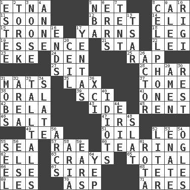 ACROSS 1. Inactive volcano in Sicily 5. Fish or hair follower 8. Automobile 11. Within a short period 12. Cy Young winner Saberhagen 14. Biblical high priest 15. Marketplace scale 17. Tall tales 18. Part of a journey 19. Substance 21. R.R. building 22. Flowery wreath 23. Make supply last 24. Lair 25. Hit sharply and swiftly 27. Be seated 28. Burn to charcoal 31. Floor coverings 35. Not strict 37. Heavy book 38. Taken by mouth 39. _-fi 41. Washington bills 42. Actor Lugosi 43. Binary compound 45. Monthly bill 46. Table seasoning 47. Big collection agency 49. Beverage made from leaves 51. Petroleum 52. Lion 55. Ocean 57. Actress Charlotte 60. Pulling into pieces 62. Pipe bend 63. Trading vessels 65. "_____ Recall" 66. Compass dir. 67. Father 68. Wig 69. French article 70. Viper 71. Ancient Greek god of war DOWN 1. First name in cosmetics 2. Cod relative 3. Trap for birds or small mammals 4. Queen of England 1702-14 5. Basketball assoc. 6. Blunders 7. Portable shelter 8. Portable communications device 9. Toward shelter 10. Swiss mountan, "Queen of the Mountains" 13. Russian ruler of old 16. Extremities 17. Gossips 20. To provide with a ceiling 26. Thespian 29. So be it 30. Relief 31. Crowds into 32. Length times width 33. Baron Munchausen's specialties 34. Chalkboard 36. One more than ninety 40. Foolish or stupid persons 44. 4th largest of the Great Lakes 48. Narrow board 50. Curves 52. 61 cubic inches 53. Related on the mother's side 54. Stares 55. Sew up the eyelids of hawks and falcons 56. Otherwise 58. Roberta Peters solo 59. Hearing organs 61. Roll call or roster of names 64. Slangy assent
