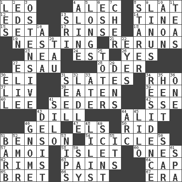 ACROSS 1. Lion 4. Actor Baldwin 8. Narrow board 12. Begley and Asner 13. Agitate, as a liquid 14. Prong on a fork 15. Bristle 17. Wash lightly 18. Small Philippine buffalo 19. Inhabiting a nest 21. Summer TV shows 23. Teachers' org. 24. Eastern Standard Time (abbr.) 26. It is so 27. Son of Isaac 28. Baltic tributary 30. Biblical high priest 31. Chalkboards 34. 17th letter of the Greek alphabet 37. 54 in ancient Rome 38. Consumed 39. Car or cant ending 40. Area sheltered from the wind 41. Spring feasts 42. Compass dir. 43. Deli pickle 44. Came down and settled, as after flight 46. Set 47. Raised railways 50. To free from 51. Gillaume's butler role 54. Winter's stalactites 57. Mine, in Marseilles 58. Small island 60. Singles 62. Basketball hoops 63. Aches 64. Head covering 65. Cy Young winner Saberhagen 66. System (abbr.) 67. Period DOWN 1. French article 2. Paradise 3. Clearly or manifestly demonstrative 4. Place in a line 5. Yearns 6. Double-curved letter 7. "Mermaids" star 8. A viewer who gazes fixedly 9. "_ and Lucy" (Charlie Brown theme song) 10. At once, immediately (arch.) 11. Beverages made from leaves 13. _ Lanka 16. At sea 20. The 19th letter of the Greek alphabet 22. Snake ____ (dice throw) 25. Carrier 27. Writer Wiesel 29. Habitations of wild animals 30. Pipe bend 31. Sew up the eyelids of hawks and falcons 32. Dipping utensil 33. Had dinner 34. Home 35. Behest 36. Single 41. Grain storage tower 43. Stop 44. Curve 45. _ and Stitch 46. Dwarf 48. Ms. Damita and namesakes 49. Odor 51. Sharp remark 52. Arab leader 53. Pinches, bites 55. ___ a Wonderful Life 56. Burn superficially 59. Declare 61. Health resort