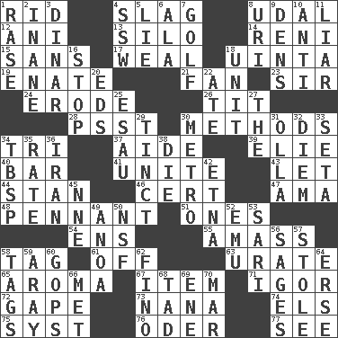 ACROSS 1. To free from 4. Volcanic refuse 8. Hereditary estate 12. Black tropical American cuckoo 13. Grain storage tower 14. Painter Guido (1575-1642) 15. Without 17. Welt 18. National forest in Provo, Utah 19. Maternal 21. Air blower 23. Title for a knight 24. Eat (away) 26. Teat (slang) 28. Inconspicuous attention getter 30. Modes 34. Three (prefix) 37. Assistant 39. Writer Wiesel 40. Soap unit 41. Join together 43. Allow 44. Comedian Laurel of Laurel & Hardy 46. Foregone conclusion 47. Wet nurse (var.) 48. Pre-World Series prize 51. Washington bills 54. Followers of ems 55. Collect or gather 58. Label 61. Below a satisfactory level 63. A salt of uric acid 65. Scent 67. Detail 71. Russian composer Stravinsky 72. Open wide 73. Nanny 74. Raised railways 75. System (abbr.) 76. Baltic tributary 77. Perceive with the eye DOWN 1. To erase 2. Silly 3. Middle Eastern gold or silver currency 4. Compass dir. 5. Falsehood 6. Chicken ___ king 7. _ course 8. RI univ. 9. Hiding places for outlaws 10. Against 11. One who doesn't tell the truth 16. Discontinue 18. A single undivided whole 20. Begley and Asner 22. Had dinner 25. Son of Isaac 27. Definite Article 29. Colored lightly or faintly 30. Paris' subway 31. Spanish pot 32. South Vietnam president (1954) 33. Stalk of a moss capsule 34. Cook's measure (abbr.) 35. Assign a rank or rating to 36. SW Asia republic 38. Pass on 42. Inactive volcano in Sicily 45. Compass dir. 49. Small Philippine buffalo 50. Science/research agcy. 52. Australian flightless bird 53. Indian skirt 56. Gurus 57. Took without asking 58. Labels 59. Like ___ of sunshine 60. Republicans 62. A pale, very dry sherry 64. Celtic language 66. Was introduced to 68. Small boy 69. Compass dir. 70. Make imperfect