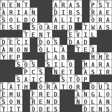 ACROSS 1. Monthly bill 5. Ancient river in northeast Turkey 9. Pacific Standard Time (abbr.) 12. Believer in; advocate of (suffix) 14. Claim 15. Actress Charlotte 16. Twentieth part of a lira 17. Came down and settled, as after flight 18. Mouth or opening 19. Compass dir. 20. Flew 23. It was, poetically 24. Portable shelter 25. Morally bad or wrong 27. Tenth: prefix 30. Two (Sp.) 32. June honoree 33. At once, immediately (arch.) 34. Spanish pot 36. John Ritter's dad 38. Slangy assent 39. Experiment locale 40. Madame (abbr.) 43. Distress signal 46. Grain storage tower 48. Hindu Mythology: god of death 49. Personal Computers (abbr.) 51. Fish or hair follower 52. SW Saudi Arabia district 53. Ketch in the Levant 54. Halt 56. Thin strip of wood or metal 58. Speaker 61. Fr. "Yes" 64. Australian flightless bird 65. Flintstone 66. White American of non-Hispanic descent 68. Manchild 69. Tear apart 70. Pitcher Ryan 71. Teat (slang) 72. Lyric poems 73. Hiding places for outlaws DOWN 1. Raze (variant) 2. Greek god of love 3. The longest river in the world 4. Bit 5. The sixth month of the Jewish calendar 6. Cause heat under the collar 7. Remained 8. Fast jet (abbr.) 9. Move like a hungry wolf 10. "Two Mules for Sister ____" 11. Afternoon social gatherings 13. Characteristic smell of wine 21. Southwest Nigerian state 22. Ringlike coral islands and reefs 23. Event that recurs at intervals 24. Shallow baking pan 26. Large container 27. 24 hours 28. Compass dir. 29. 911 reaches them 31. Killed 35. Most capable 37. Dec. holiday 41. Medical imaging device (abbr.) 42. Ewer handle 44. Brightly colored fish 45. _-fi 47. "Beetle Bailey" pooch 48. Atlas unit 50. Tallied 53. Check the growth or development of 55. Northwest Algerian city 56. For fear that 57. Mine, in Marseilles 59. French philosopher Descartes 60. Does sums 61. Stare at amorously 62. Uhlan (variant) 63. Charged atoms 65. From 67. Dreamland