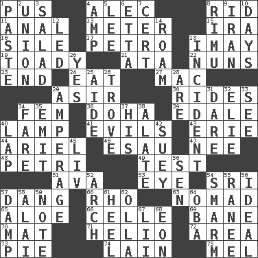 ACROSS 1. Festering 4. Actor Baldwin 8. To free from 11. Of or related to the anus 13. Distance measurement 15. Retirement account (abbr.) 16. Drop; flow; fall 17. Stone: prefix 18. "If ____ say so..." 19. Sycophant 21. _ moment's notice (2 wds.) 22. Religious women 23. Conclusion 24. Consume 27. Big _ 29. SW Saudi Arabia district 30. Amusement-park features 34. Opposite of masc. 36. Capital of the state of Qatar 39. Peak District village in England 40. Desk light 41. Vices 43. 4th largest of the Great Lakes 44. Satellite of Uranus 46. He sold his birthright 47. Born 48. _ dish (used to culture cells) 49. Trial 51. Actress Gardner 53. Sight organ 54. _ Lanka 57. Mild oath, euphamism for damn 60. 17th letter of the Greek alphabet 63. Wanderer 65. _ vera 66. Cell (Danish) 69. Object of repulsion 70. Floor protector 71. Sun: prefix 72. Type of rug 73. Sliced dessert 74. (Had) reclined 75. Cartoonist voice _ Blanc DOWN 1. Thick mixture 2. The state of being joined or united 3. First course 4. Electrical Unit 5. Area sheltered from the wind 6. Singer James 7. Foregone conclusion 8. Tall New Zealand timber tree 9. SW Asia republic 10. 24-hour periods 12. Directed 14. Wander 18. Happening 20. Affirmative reply 25. Assistant 26. Collection of objects 28. "We ___ not amused" (Victoria) 29. Electrical Measurement 31. Have the gumption 32. Writer Wiesel 33. Observe 34. Conductor's collection 35. Give off 37. Part of HMS, perhaps 38. Having winglike extensions 40. Pet locale 42. Chop _ 45. 54 in ancient Rome 50. Elected rep. 52. Bowlike part 54. Excessive but superficial compliments 55. Indian princess (variant) 56. Perfect 57. Moist 58. Mountain range southwest of Kyrgyzstan 59. Observe 61. Person who is morally reprehensible 62. Rounded earthenware pot or jar 64. Chief or king in Benin or Nigeria 67. Cards in a Roman deck? 68. A really long time