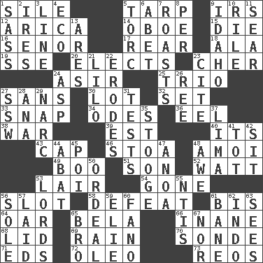 ACROSS 1. Filth; sediment 5. Canvas cover 9. Big collection agency 12. N. Chile seaport 14. Mitch Miller's instrument 15. Expire 16. Sir (Sp.) 17. Located in or toward the back 18. Wing 19. Compass dir. 20. Opts 23. "Mermaids" star 24. SW Saudi Arabia district 25. Musical group of three 27. Without 30. Car dealer's back yard 32. Put into a specified state 33. Fastener 34. Lyric poems 36. Snakelike fish 38. Armed conflict 39. Eastern Standard Time (abbr.) 40. ___ a Wonderful Life 43. Head covering 46. Portico 48. Mine, in Marseilles 49. Oct. 31 cry 51. Manchild 52. Electrical Unit 53. Den 54. Went 56. Position in a hierarchy or organization 58. Outscore 61. Twice 64. Boat paddle 65. Actor Lugosi 66. Silly 68. Flaplike covering 69. Water falling in drops from the sky 70. Message 71. Begley and Asner 72. Butter sub 73. Vintage cars DOWN 1. Backtalk 2. Angers 3. Actor's bit 4. Environmental prefix 5. Torque (variant) 6. Collude with 7. Exposes to great heat 8. For each 9. Potato state 10. Cause heat under the collar 11. Singe 13. Ancient Greek god of war 21. _ and Stitch 22. Eats (away) 23. Quote 24. Viper 26. To sift 27. Compass dir. 28. Santa ___, CA 29. Drug cop 31. Trials 35. Moe Howard, for one 37. Pale green bean 41. Small child 42. Be seated 44. Blind as ____ 45. Luau course 47. Small Philippine buffalo 48. Deep reverence 50. Severe or trying experience 53. Domineers 55. Nuclear Threat Initiatives 56. Flatfish 57. Put down 59. Writer Wiesel 60. Papal veil 61. Object of repulsion 62. _ china 63. Perceives with the eye 65. Sis' sibling 67. Not either
