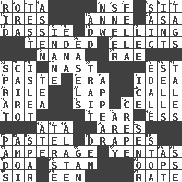 ACROSS 1. Roll call or roster of names 5. Science/research agcy. 8. Be seated 11. Angers 12. Queen of England 1702-14 13. White ___ sheet 14. Small ungulate mammals of Africa 17. Home 19. Looked after 21. Chooses 22. Grandmother 23. Actress Charlotte 24. _-fi 27. Political cartoonist Thomas 29. Eastern Standard Time (abbr.) 32. Thick mixture 34. Period 36. The main thing one is thinking about 37. Cause heat under the collar 38. Infant locale 39. Give a ring to 40. Type of rug 41. Small drink 42. Cell (Danish) 43. Small child 44. Lacerate 46. Double-curved letter 47. "One Day ___ Time" 50. Ancient Greek god of war 52. Soft color 55. Window treatments 57. Electrical Measurement 59. Gossips 62. ___ good deed 63. Comedian Laurel of Laurel & Hardy 64. I made a mistake 65. Title for a knight 66. Car or cant ending 67. Pace DOWN 1. To free from 2. Mouth or opening 3. Trial 4. NE Netherlands city 5. Compass dir. 6. Contemptuous expression 7. Man or boy (slang) 8. Ketch in the Levant 9. Is not 10. Labels 12. Increase 15. Lacking in sense or substance 16. Pulitzer Prize-winning author Ferber 18. Area sheltered from the wind 20. Artist's stands 24. Small fatty European fish 25. Capital of Egypt 26. Small island 28. Distinguishing feature 29. Peak District village in England 30. Exchanges for money 31. Stories 33. Afternoon social gathering 35. Seem 36. Frozen water 42. Streamer paper 45. Like ___ of sunshine 47. Had dinner 48. Laconic 49. Having winglike extensions 51. Sir (Sp.) 52. Groovy apts. 53. Mine, in Marseilles 54. Coast Guard woman 55. Lair 56. Portico 58. Separate the seeds from cotton 60. Fitting 61. Compass dir.