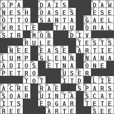ACROSS 1. Health resort 4. Raised platform 8. Simpleton 11. Delicate 13. Fertile tracts in a desert 15. Compass dir. 16. Von Bismarck 17. Before Barbara or Clara 18. Highlander 19. Compose 21. The 19th letter of the Greek alphabet 22. Spoken 23. Title for a knight 24. Crowd into 27. HTML Container Element 29. Governing power 30. Trials 34. Born 36. Relaxation 39. Nick name for Arthur 40. Mass 41. American astronaut and politician John 43. Nanny 44. Goodbye (Sp.) 46. Inactive volcano in Sicily 47. Single 48. Stone: prefix 49. One who makes use of a thing 51. Small child 53. It would 54. Falsehood 57. Measure of real estate 60. Actress Charlotte 63. Practice fights 65. Fly high 66. National forest in Provo, Utah 69. Get outta here! 70. It is 71. _ Allan Poe 72. False hair 73. To sift 74. Johnson of "Laugh-In" 75. Observe DOWN 1. Frozen precipitation (plural) 2. _ dish (used to culture cells) 3. Moving about 4. Two (Sp.) 5. Auto club (abbr.) 6. Is not 7. Stalk of a moss capsule 8. Letter starter 9. Toward the sea 10. Not ill 12. Being at a high temperature 14. Saudi Arabian king (1953-1964) 18. State head 20. Australian flightless bird 25. Cassini of fashion 26. Memphis, Tenn. Street 28. Call ___ day 29. Newsperson 31. Comedian Laurel of Laurel & Hardy 32. Prong on a fork 33. Ocean 34. Naked 35. Give off 37. Arrange properly for use 38. World-weariness 40. Infant locale 42. Political cartoonist Thomas 45. "Barney Miller" actor Jack 50. Begley and Asner 52. Loyal 54. Shoestrings 55. Feeling or showing extreme anger 56. First name in cosmetics 57. SW Saudi Arabia district 58. ____ d'Azur (French Riviera) 59. To erase 61. Opera by Verdi 62. Engineer (abbr.) 64. Pacific Standard Time (abbr.) 67. Make lace 68. "We ___ not amused" (Victoria)