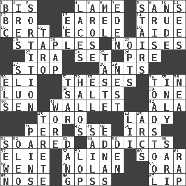 ACROSS 1. Again 4. Unable to walk 8. Without 12. Sis' sibling 13. Having ears or earlike features 14. Loyal 15. Certainty 17. Learning spot: Fr. 18. Helper 19. Paper fasteners 21. Annoying sounds 23. Lyricist Gershwin 24. Arrange properly for use 26. Before (prefix) 27. Halt 28. Pismires 30. Connecticut Ivy Leaguer 31. College papers 34. Shallow baking pan 37. Nilotic language 38. Table seasonings 39. Single 40. Elected rep. 41. Place for singles 42. Insect wing 43. "Corrida" creature 44. Kenny Rogers chart-topper in '80 46. For each 47. Compass dir. 50. Big collection agency 51. Flew 54. Inveterate users 57. Writer Wiesel 58. Place in a line 60. Fly high 62. Gone 63. Pitcher Ryan 64. Mouth or opening 65. Olfactory organ 66. Global Positioning Systems (abbr.) 67. Mouth edge DOWN 1. English channel? 2. Angers 3. Making a chance decision by using lots 4. Shoestrings 5. Came up 6. Cartoonist voice _ Blanc 7. Locale of original sin 8. Flight of steps 9. Originate 10. Naked 11. Perceives with the eye 13. Snakelike fish 16. Pacific island yam 20. Infant food 22. Elects 25. Clothes sense 27. Turn sharply 29. Egg locale 30. Raised railways 31. Russian ruler of old 32. Saint headwear 33. Pipe bend 34. Inedible or poisonous agaric 35. Inwardly 36. Teachers' org. 41. Had on 43. Cigar-shaped 44. Cards in a Roman deck? 45. Arches 46. Aches 48. Moves on water 49. Ferber et al. 51. Stitched 52. Margarine 53. Mild oath, euphamism for damn 55. Lair 56. Indian skirt 59. Trim (branches) 61. Reproach for some lapse or misdeed