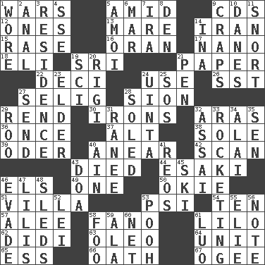 ACROSS 1. Armed conflicts 5. Among 9. Music discs 12. Singles 13. Female horse 14. SW Asia republic 15. To erase 16. Northwest Algerian city 17. Billionth: prefix 18. Biblical high priest 19. Indian title of respect (Mr.) 21. Some stationery 22. Tenth: prefix 24. Purpose 26. Fast jet (abbr.) 27. Former Milwaukee Brewers owner Bud 28. The Jewish people; Israel 29. Tear apart 30. Removes the wrinkles 32. Ancient river in northeast Turkey 36. Single time 37. Keyboard modifier key 38. Flatfish 39. Baltic tributary 40. Approach 42. Skim 43. Passed on 44. 1973 Nobel Price Winner (Physics) Leo 46. Raised railways 49. Single 50. Migrant worker of the '30s 51. Country estate 53. Air pressure measure (abbr.) 54. Nine, plus one 57. Toward shelter 58. Papal veil 61. _ and Stitch 62. "You Light Up My Life" star Conn 63. Butter sub 64. A single undivided whole 65. Curvy letter 66. Pledge 67. Double curve, resembling the letter S DOWN 1. Had on 2. Of or related to the anus 3. Home 4. Compass dir. 5. Mine, in Marseilles 6. Make imperfect 7. Retirement account (abbr.) 8. Lair 9. Dice game 10. Natives or inhabitants of Denmark 11. Derisive sound 14. _ tizzy (2 wds.) 19. _-fi 20. Swiss mountan, "Queen of the Mountains" 21. Animal enclosure 23. A person who is older than you are 24. National forest in Provo, Utah 25. Mayday 27. Post 28. Having a sole or soles 29. Friend of Pooh 31. The wife of a rajah (variant) 32. Slender Brazilian palm 33. Shooting up abruptly 34. Jai _ 35. Elected rep. 40. The 18th letter of the Arabic alphabet 41. Vintage cars 43. ___ good deed 45. What Jean-Claude Killy likes to do 46. Elude 47. Ms. Damita and namesakes 48. Bobsleighs 52. Flowery wreath 53. "Silly old bear" 55. Writer Wiesel 56. Short letter 58. Egg _ yung 59. In the manner of 60. Fish or hair follower 61. Nilotic language