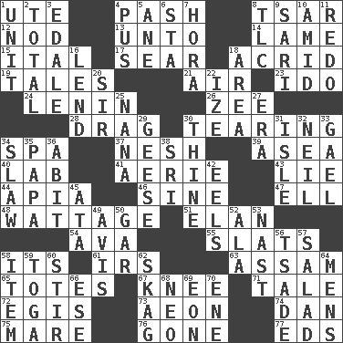 ACROSS 1. Shoshoni 4. Romantic infatuation 8. Russian ruler of old 12. Dreamland 13. To (old English) 14. Unable to walk 15. Slanted text style (abbr.) 17. Singe 18. Bitter 19. Stories 21. Atmosphere 23. Wedding promise 24. Soviet premier 1918-24 26. Last letter of the English alphabet 28. To trail on the ground 30. Pulling into pieces 34. Health resort 37. Soft 39. Toward the sea 40. Experiment locale 41. Nest on high 43. Untruth 44. Capital of Western Samoa 46. Trig term 47. Pipe bend 48. Electrical Measurement 51. Flair 54. Actress Gardner 55. Narrow boards 58. ___ a Wonderful Life 61. Big collection agency 63. Indian state 65. Lugs 67. Leg joint 71. Falsehood 72. Armor plate that protects the chest 73. Age 74. One of the 12 tribes of Israel 75. Female horse 76. Went 77. Begley and Asner DOWN 1. A single undivided whole 2. "_____ Recall" 3. Peak District village in England 4. Suppuration 5. A saturated hydrocarbon 6. R.R. building 7. Israeli folk dance 8. Affectionate concern, for short 9. Indian skirt 10. Among 11. Make new 16. Grant temporary use of 18. Length times width 20. Title for a knight 22. Ending with capital 25. Grandmother 27. Period 29. Honkers 30. One or ones belonging to thee 31. Small island 32. Famous astronaut Armstrong 33. Highlander 34. Cole _ (cabbage dish) 35. Dad 36. "This won't hurt ____!" 38. _ Lanka 42. Snakelike fish 45. _ moment's notice (2 wds.) 49. Opinion 50. Slender fish 52. In the manner of 53. Political cartoonist Thomas 56. Sadhe (variant) 57. Vegetable dish 58. A distinct part 59. Ancient Roman robe 60. Commotion 62. Heroin 64. Not women's 66. Compass dir. 68. Modern: prefix 69. Period of immesurable duration 70. Compass dir.