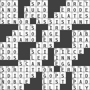 ACROSS 1. ___ good deed 4. Health resort 7. Cy Young winner Saberhagen 11. Plus 12. Old (Scot.) 13. Eat (away) 14. Frozen water 15. Nourish 16. Chalkboards 17. Sir (Sp.) 19. Helper 21. French article 23. Angers 24. In addition 25. Mature 26. Small moist lump or mass 29. Potato state 30. Followers of ems 31. Retirement account (abbr.) 32. Cuckoo 33. Big collection agency 34. R.R. building 35. Wedding promise 36. _-fi 37. Component 40. Two (Sp.) 41. Area sheltered from the wind 42. Restaurants 43. Glance over 45. Oval reproductive body of a fowl 46. Making a chance decision by using lots 51. Bert's buddy 55. Foolish or stupid persons 56. Republicans 58. It would 59. Impressive in appearance 60. For fear that 61. Writing tablet 62. Celtic language 63. Connecticut Ivy Leaguer 64. Secret DOWN 1. Raised platform 2. At one time in the past 3. An important port of Yemen 4. Take to court 5. Entreaty 6. Does sums 7. Naughty children 8. Round or rotation of duties 9. Paradise 10. Trial 12. Anew 13. Otherwise 16. Titles for men of rank and authority 18. Spanish pot 20. Signals 22. "Barney Miller" actor Jack 24. Goodbye (Sp.) 25. Nest on high 26. Flat circles 27. Johnson of "Laugh-In" 28. Sound made by sheep 29. _ china 32. Help 33. Ancient Celtic tribe of eastern Britain 36. Narrow boards 37. Sliced dessert 38. Swallow 39. Engineer (abbr.) 43. Fur scarf 44. Quote 46. Trig term 47. Aroma 48. Chest bones 49. Stare at amorously 50. Christmas carol 52. Pinches, bites 53. Slanted text style (abbr.) 54. Whirlpool 57. Air pressure measure (abbr.)