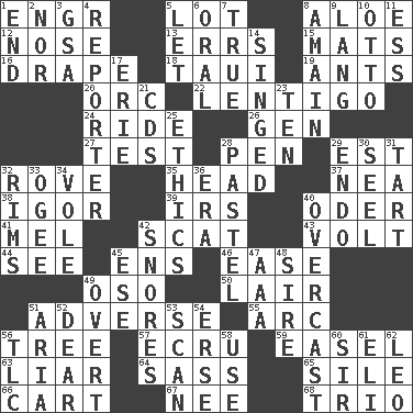 ACROSS 1. Engineer (abbr.) 5. Car dealer's back yard 8. _ vera 12. Characteristic smell of wine 13. Blunders 15. Floor coverings 16. Window treatment 18. "Change" in Tahitian 19. Pismires 20. The grampus (Milton) 22. Small, flat, pigmented spot on the skin 24. Travel on or in a vehicle 26. Commissioned military rank (abbr.) 27. Trial 28. Fenced enclosure 29. Eastern Standard Time (abbr.) 32. Be footloose 35. Froth on beer 37. Teachers' org. 38. Composer Stravinsky 39. Big collection agency 40. River in Europe 41. Cartoonist voice _ Blanc 42. Scram, to a cat 43. Electrical Unit 44. Observe 45. Followers of ems 46. Relaxation 49. Bear (Spanish) 50. Den 51. Contrary to your interests or welfare 55. Curve 56. Relationship diagram 57. Shade of tan 59. Artist's stand 63. One who doesn't tell the truth 64. Backtalk 65. Filth; sediment 66. Draw slowly or heavily 67. Born 68. Musical group of three DOWN 1. Conclusion 2. And not 3. Girls' org. (abbr.) 4. News announcer 5. Allow 6. Taken by mouth 7. Loyal 8. At full speed 9. Long (Scottish) 10. Von Bismarck 11. Double-curved letter 14. Burned superficially 17. One of the Great Lakes 21. Music discs 23. "___ Little Indians" 25. Value system 28. Soft color 29. Inside; within (prefix) 30. Sew up the eyelids of hawks and falcons 31. Small pie 32. Basketball hoops 33. Double curve, resembling the letter S 34. Short-tailed, large-bodied rat 36. Period 40. Cloudy 42. Sounds asleep 45. Compass dir. 47. Auto club (abbr.) 48. Title for a man of rank and authority 49. Unconcealed 51. Operatic vocal solo 52. Letter starter 53. Examine minutely or intensely 54. Celtic language 56. Affectionate concern, for short 58. Purpose 60. Title for a knight 61. Biblical high priest 62. Lion