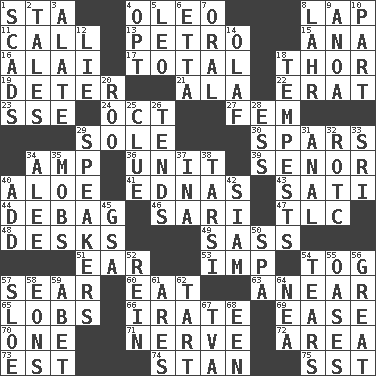 ACROSS 1. R.R. building 4. Margarine 8. Pet locale 11. Give a ring to 13. Stone: prefix 15. Santa ___, CA 16. Mountain range southwest of Kyrgyzstan 17. "_____ Recall" 18. Son of Odin 19. Prevent from occurring 21. In the manner of 22. Part of Q.E.F. 23. Compass dir. 24. Sep. follower 27. Opposite of masc. 29. Flatfish 30. Practice fights 34. Electrical Unit 36. A single undivided whole 39. Sir (Sp.) 40. Medicinal plant 41. Ferber et al. 43. Suttee (variant) 44. Debunk (Brit. slang) 46. Indian skirt 47. Affectionate concern, for short 48. Writing tables 49. Backtalk 51. Hearing organ 53. Naughty child 54. Coat; cloak 57. Scorch 60. Erode 63. Approach 65. Tennis shots 66. Feeling or showing extreme anger 69. Relaxation 70. Single 71. Impudent aggressiveness 72. Type of rug 73. Eastern Standard Time (abbr.) 74. Comedian Laurel of Laurel & Hardy 75. Fast jet (abbr.) DOWN 1. Heaps 2. Falsehoods 3. Having winglike extensions 4. Choose 5. Lion 6. Singer James 7. Spoken 8. Cowardly lion portrayer 9. Small Philippine buffalo 10. Component 12. Whopper 14. Norwegian king 18. Storms 20. Friend of Pooh 25. A slight indication 26. Is inclined (to) 28. Double-curved letter 29. Orators 31. Of or related to the anus 32. College mil. group 33. Indian title of respect (Mr.) 34. Toward shelter 35. Crowds into 37. _ tizzy (2 wds.) 38. Tarsus (plural) 40. Say or write further 42. Thailand, formerly 45. Girls' org. (abbr.) 50. Health resort 52. It's straight from the horse's mouth 54. Rends 55. Fertile tracts in a desert 56. Relatively large 57. A type of plum 58. Immeasurably long periods of time 59. Collude with 61. Ancient Greek god of war 62. Small pie 64. Teachers' org. 67. Federal power corp. 68. Car or cant ending