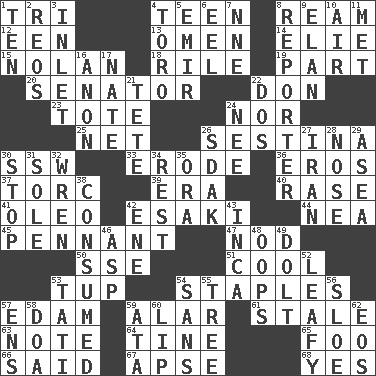 ACROSS 1. Three (prefix) 4. Adolescent 8. 480, 500 or 516 sheets of paper 12. Car or cant ending 13. Presage 14. Writer Wiesel 15. Pitcher Ryan 18. Cause heat under the collar 19. Component 20. Legislator 22. Spanish title 23. Carryall 24. Or not 25. Fish or hair follower 26. French poetic form 30. Compass dir. 33. Eat (away) 36. Greek god of love 37. Torque (variant) 39. Period 40. Raze (variant) 41. Butter sub 42. 1973 Nobel Price Winner (Physics) Leo 44. Teachers' org. 45. Pre-World Series prize 47. Allow head to fall sleepily 50. Compass dir. 51. Calm and collected 53. Uncastrated adult male sheep 54. Paper fasteners 57. Dutch treat 59. Having or resembling wings 61. Having lost freshness 63. Make mention of 64. Prong on a fork 65. Egg _ yung 66. Stated 67. Domed church section 68. It is so DOWN 1. "___ Little Indians" 2. Vintage cars 3. An arm off of a larger body of water 4. "Corrida" creature 5. Arab leader 6. Snakelike fish 7. Compass dir. 8. Newsperson 9. Enthusiasm 10. Atmosphere 11. Was introduced to 16. At once, immediately (arch.) 17. Nathan's nickname 21. Wig 22. Two (Sp.) 24. Born 26. Neighbor of Neb. 27. SW Asia republic 28. Characteristic smell of wine 29. Toward the sea 30. Obstruct or block passage 31. Flatfish 32. Songbird 34. State of inaction 35. Mouth or opening 38. Eaten 42. Compass dir. 43. South American Indian 46. Cleo's killer 48. I made a mistake 49. Dunce 52. Like summer trees 53. Jacques of French films 54. Without 55. Woody plant 56. _ gin 57. Followers of ems 58. ___ good deed 59. "One Day ___ Time" 60. Mouth edge 62. Greek goddess of the dawn