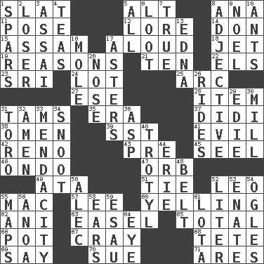 ACROSS 1. Narrow board 5. The first octave above the treble staff 8. Santa ___, CA 11. Introduce or present, as a question 12. Old wives' tales, e.g. 14. Spanish title 15. Indian state 17. Verbally 18. Passenger plane 19. Thinks logically 21. "___ Little Indians" 22. Raised railways 23. Indian title of respect (Mr.) 24. Car dealer's back yard 25. Curve 27. Compass dir. 28. Detail 31. Scottish caps 35. Epoch 37. "You Light Up My Life" star Conn 38. Presage 39. Fast jet (abbr.) 41. Morally bad or wrong 42. Western Nevada city 43. Before (prefix) 45. Sew up the eyelids of hawks and falcons 46. Southwest Nigerian state 47. Globe 49. _ moment's notice (2 wds.) 51. Neckwear 52. Lion 55. Apple computer (short form) 57. Area sheltered from the wind 60. Crying or shouting loudly 62. Cuckoo 63. Artist's stand 65. "_____ Recall" 66. Cooking vessel 67. Supercomputer manufacturer 68. Wig 69. Declare 70. Take to court 71. Ancient Greek god of war DOWN 1. Practice fights 2. Failure 3. Slender Brazilian palm 4. Afternoon social gatherings 5. Everything 6. Plunder 7. Loyal 8. Descriptive word 9. Christmas carol 10. Pismires 13. Pulitzer Prize-winning author Ferber 16. Undercover agent 17. Michaelmas daisies 20. Characteristic smell of wine 26. Amusement-park features 29. Singer Brickell 30. Place where flour is made 31. "Corrida" creature 32. So be it 33. Ananias' fault 34. Snob 36. Viper 40. Trinitrotoluene 44. One of the Great Lakes 48. Waist strap 50. Actor Baldwin 52. 61 cubic inches 53. Maternal 54. Stares at amorously 55. Atlas contents 56. Small Philippine buffalo 58. Hearing organs 59. Son of Isaac 61. Globular water bottle used in Asia 64. Sight organ