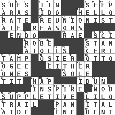 ACROSS 1. Institutes legal proceedings 5. Metal container 8. Ooze 12. Ancient river in northeast Turkey 13. Wedding promise 14. Phone greeting 15. Pace 16. One who advocates reunion 19. Had dinner 20. Thinks logically 21. Inside; within (prefix) 23. Actress Charlotte 24. _-fi 27. Loose flowing garment 30. Comedian Laurel of Laurel & Hardy 31. Ringlike coral islands and reefs 34. Certainty 35. Pack (down) 38. Flexible twig of a willow tree 40. "Beetle Bailey" pooch 41. Double curve, resembling the letter S 42. One or the other 44. Singles 45. Flatfish 46. Teat (slang) 47. Atlas unit 50. Goddess of spring and wife of Bragi 53. Heighten or intensify 57. Lower and raise head in agreement 59. Supplementary 63. _ and Stitch 64. Get behind 65. Baking dish 66. Slanted text style (abbr.) 67. Assistant 68. Compass dir. 69. Gouge DOWN 1. "Two Mules for Sister ____" 2. A salt of uric acid 3. Consumed 4. Compass dir. 5. Become fatigued 6. The main thing one is thinking about 7. Good sense 8. Elected rep. 9. Connecticut Ivy Leaguer 10. Raised railways 11. Cooking vessel 14. Stockings 17. Or not 18. _ tizzy (2 wds.) 20. Carrot, for example 22. Window treatments 24. Proofreading order 25. Haul 26. To the inside or interior of 28. Sometimes accompanies a hiss 29. Otherwise 30. Tallied 32. Cards in a Roman deck? 33. Puts into a specified state 35. A blast of a horn 36. Hindu god of fire 37. Confront 39. 17th letter of the Greek alphabet 43. Writer Wiesel 47. Place where flour is made 48. One (Scot) 49. Pacific Standard Time (abbr.) 51. Join together 52. Pitcher Ryan 54. Corncob 55. _ the terrible 56. French philosopher Descartes 58. Stupid person 59. R.R. building 60. RI univ. 61. Writing tablet 62. Sliced dessert 63. Flaplike covering