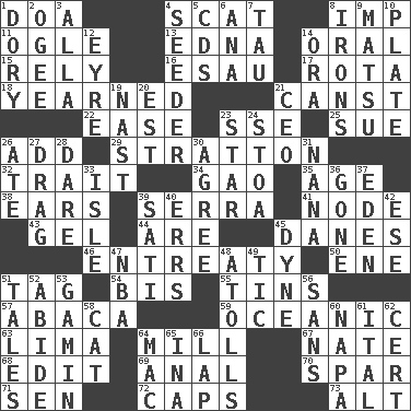 ACROSS 1. ___ good deed 4. Jazz singing style 8. Naughty child 11. Stare 13. Pulitzer Prize-winning author Ferber 14. Relating to the mouth 15. Trust 16. Son of Isaac 17. Roll call or roster of names 18. Had a strong desire 21. 2nd pers. sing. pres. of can (arch.) 22. Relaxation 23. Compass dir. 25. Take to court 26. Increase 29. Ski resort town in Vermont 32. Distinguishing feature 34. E Mali city 35. Grow older 38. Hearing organs 39. Father Junipero _ 41. Thickened enlargement 43. Set 44. "We ___ not amused" (Victoria) 45. Natives or inhabitants of Denmark 46. Plea 50. Compass dir. 51. Label 54. Twice 55. Airtight sealed metal containers 57. Phillipine bananalike plant 59. Pertaining to the sea 63. Pale green bean 64. Place where flour is made 67. Nathan's nickname 68. Prepare for publication 69. Of or related to the anus 70. Practice fight 71. Elected rep. 72. Balmoral and tarboosh 73. Keyboard modifier key DOWN 1. Rowboat 2. Double curve, resembling the letter S 3. Silent film actress Nazimova 4. Sowing specialist 5. Music discs 6. Santa ___, CA 7. The 19th letter of the Greek alphabet 8. Metal shackles 9. Taiwanese island in East China Sea 10. Food holder 12. Jane of fiction 14. Mouth or opening 19. Political cartoonist Thomas 20. Eastern Standard Time (abbr.) 21. Corporate head (abbr.) 23. Play the lead 24. Portico 26. Had dinner 27. To draw with force 28. Have the gumption 30. Match 31. Nanny 33. Small island 36. Went 37. Genesis locale 39. Suttee (variant) 40. Blunders 42. Compass dir. 45. Centimeter-gram-second unit of force 47. Basketball assoc. 48. Ringlike coral islands and reefs 49. Nervous spasm 51. Lies 52. Remain 53. Street urchin 56. Without 58. Feline 60. California wine valley 61. Slanted text style (abbr.) 62. Certainty 64. Apple computer (short form) 65. _ tizzy (2 wds.) 66. Infant locale