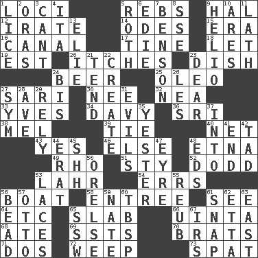 ACROSS 1. Locales 5. Confederate soldiers (slang) 9. Actor Linden 12. Feeling or showing extreme anger 14. Lyric poems 15. Period 16. Lessep's creation 17. Prong on a fork 18. Allow 19. Eastern Standard Time (abbr.) 20. Irritating cutaneous sensations 23. Food container 24. Fermented drink made from hops 25. Margarine 27. Indian skirt 30. Born 32. Teachers' org. 33. Jacques Cousteau's middle name 34. American folk hero Crockett 36. _ Lanka 38. Cartoonist voice _ Blanc 39. Standoff 40. Fish or hair follower 43. Consenting reply 46. Otherwise 48. Inactive volcano in Sicily 49. 17th letter of the Greek alphabet 51. Filthy place 52. Texas town _ City 53. Cowardly lion portrayer 54. Blunders 56. Water vessel 58. Main course 61. Observe 64. And so on (abbr.) 65. Broad, flat, thick piece 66. National forest in Provo, Utah 68. Had dinner 69. Fast planes 70. Naughty children 71. Two (Sp.) 72. Shed a tear 73. Petty quarrel DOWN 1. Louse (plural) 2. Mouths or openings 3. Patter 4. Call ___ day 5. Writer of Portnoy's Complaint (1969) 6. Singer Brickell 7. Gillaume's butler role 8. Compass dir. 9. Sun: prefix 10. Ancient Greek god of war 11. Thin strip of wood or metal 13. Writer Wiesel 21. Watch over 22. Cause to be 23. Letter starter 24. Twice 26. French article 27. Symbol (abbr.) 28. "___ Maria" 29. Trust 31. Vices 35. Next before 37. To the inside or interior of 41. Conclude 42. Bit 44. Part of Q.E.F. 45. Quiet! 47. Jane of fiction 48. Begley and Asner 50. Threatening words 53. Shoestrings 55. Reuben's nickname 56. Necklace unit 57. Von Bismarck 59. Nathan's nickname 60. Cook's measure (abbr.) 61. Fastener 62. Singer James 63. 90 degrees 65. Compass dir. 67. Big collection agency