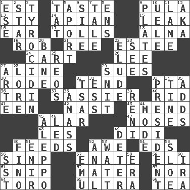 ACROSS 1. Eastern Standard Time (abbr.) 4. Clothes sense 9. Monetary unit of Botswana 13. Filthy place 14. Bee-related 15. Path through which fluid escapes 16. Ewer handle 17. For Whom the Bell _____ 18. _ mater 19. Director Reiner 21. Portuguese money of account (variant) 22. First name in cosmetics 24. Draw slowly or heavily 26. Area sheltered from the wind 27. Place in a line 29. Takes to court 30. Cowboy competition 31. Watch over 33. Parent Teacher Association (abbr.) 36. Three (prefix) 37. More disrespectful 40. To free from 41. Car or cant ending 42. Vertical spar for supporting sails 43. Make improvements or corrections to 45. Having or resembling wings 47. Olfactory organs 48. French article 49. "You Light Up My Life" star Conn 50. Eats 52. Deep reverence 54. Begley and Asner 56. Simple or foolish person 57. Related on the mother's side 59. Connecticut Ivy Leaguer 61. Sever or remove by pinching or nipping 62. Mother 63. And not 64. "Corrida" creature 65. Extreme 66. Beverage made from leaves DOWN 1. Compass dir. 2. Play the lead 3. Polypeptide antibiotic 4. Make lace 5. To the left, to Queeg 6. Drop; flow; fall 7. Story 8. Followers of ems 9. Food holders 10. Ubangi River tributary 11. Unable to walk 12. Alias (abbr.) 20. Object of repulsion 22. Dodge 23. Perceive with the eye 25. Vintage cars 27. Johnson of "Laugh-In" 28. Old wives' tales, e.g. 29. In a ____ (agitated or irritated) 31. Russian ruler of old 32. Double-curved letter 33. Elected leader of a country 34. Prong on a fork 35. Sums up 38. Collect or gather 39. Painter Guido (1575-1642) 44. Method 45. City in Syria 46. Directed 49. Prevent from occurring 50. A pale, very dry sherry 51. Independent ruler or chieftain 52. Of or related to the anus 53. Electrical Unit 55. A type of plum 56. Fast jet (abbr.) 57. Australian flightless bird 58. Period 60. Retirement account (abbr.)