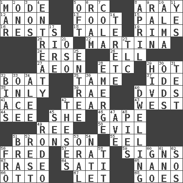 ACROSS 1. Method 5. The grampus (Milton) 8. Like ___ of sunshine 12. At once, immediately (arch.) 13. 12 inches 15. Diluted with white 16. Musical pauses 18. Lie 19. Basketball hoops 20. _ de Janeiro 22. Chrissie's court nemesis 24. Celtic language 26. Pipe bend 27. Age 28. And so on (abbr.) 29. Being at a high temperature 32. Water vessel 35. Not wild 37. Binary compound 38. In an inward manner 39. Actress Charlotte 40. Movie discs 41. Adept person 42. Pull apart 43. 270 degrees 44. Perceive with the eye 45. A female animal or person 46. Open wide 49. To separate or throw off 50. Morally bad or wrong 51. "Death Wish" actor 55. Snakelike fish 56. Flintstone 57. Part of Q.E.F. 59. Omens 63. Raze (variant) 64. Suttee (variant) 65. Billionth: prefix 66. Von Bismarck 67. Allow 68. Travels DOWN 1. Spoil 2. Single 3. Two (Sp.) 4. Plea 5. Often (poetically) 6. Wander aimlessly 7. Root beer relative 8. Showery time 9. Precipitation 10. _ mater 11. Consenting reply 14. Cylindrical with tapered ends 17. Title for a man of rank and authority 21. Bear (Spanish) 23. Affectionate concern, for short 25. Main course 28. Develop 29. Hub of activity 30. Likelihood 31. Trial 32. Prejudice 33. Single time 34. Toward shelter 36. American Automobile Association (abbr.) 40. Residence 42. College papers 45. Elected rep. 47. "___ Maria" 48. Sliced desserts 49. Cowboy competition 51. Naughty child 52. Take ten 53. Taken by mouth 54. Nathan's nickname 56. From 58. Teat (slang) 60. E Mali city 61. Compass dir. 62. Mayday